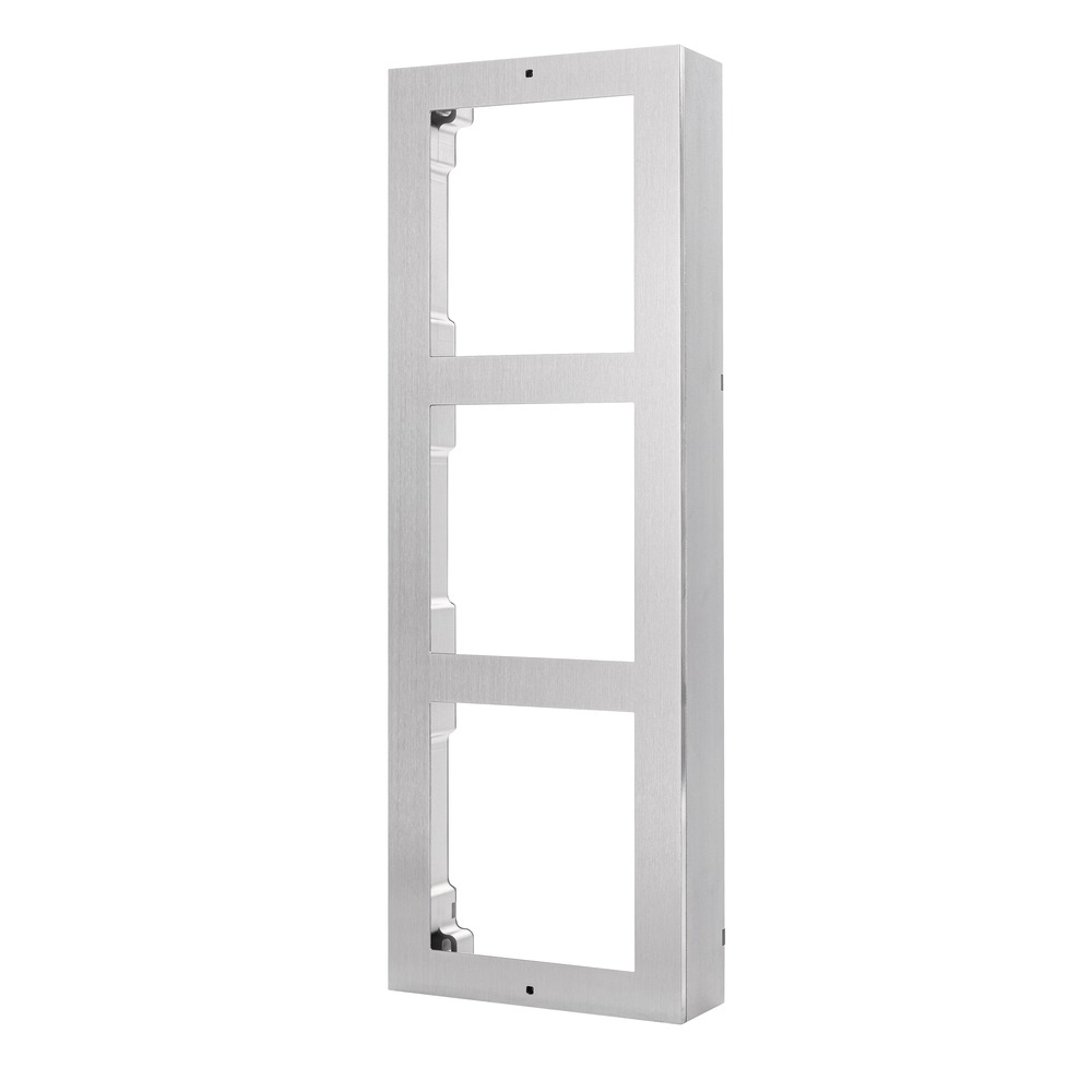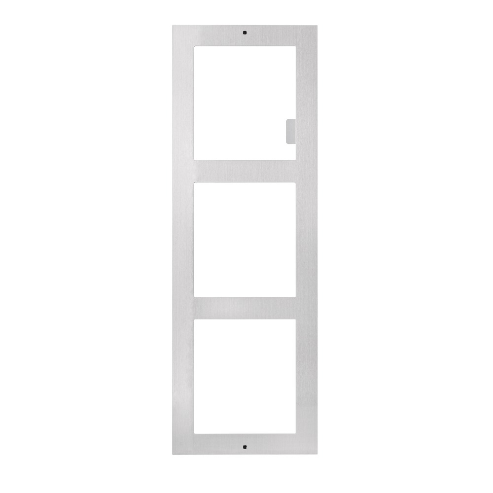 Beim Einbau von ModuVis-Modulen (Videomodul, Klingeltasten-Modul usw.) haben Sie die Wahl zwischen Auf- und Unterputzmontage. Und Sie wählen zwischen einem 1-fach Einbaurahmen (für 1 Modul), 2-fach und 3-fach Rahmen (für 3 Module). Dieser Einbaurahmen ist zur Aufputzmontage für 3 Module geeignet.
