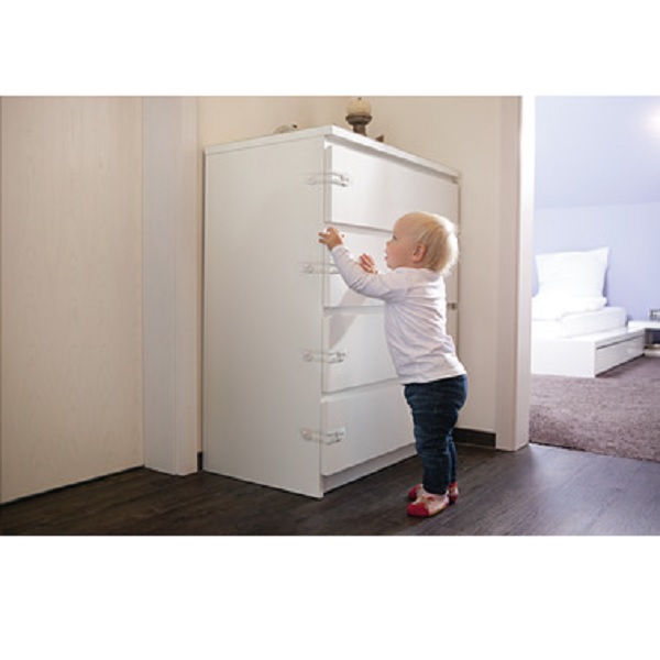 - Verriegelt Schranktüren und Schubladen und schützt Kinder zum Beispiel vor bedenklichen Substanzen (Medikamenten, Putzmittel) oder Haushaltsgeräten (Scheren, Messern und mehr)