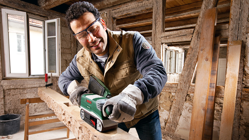 Bandschleifer PBS 75 AE Set. Schleifen mit hoher Effizienz und hohem Komfort - mit Drehzahlregelung. Effektives Schleifen - sehr leistungsstarker 750-W-Motor sorgt für einen hohen Materialabtrag. Vielseitigkeit - elektronische Drehzahlvorwahl für die perfekte Drehzahl bei jedem Material. Handlichkeit - kompakt und mit abnehmbarem Zusatzhandgriff für eine optimale Handhabung. Komfort - automatisches Bandsystem zentriert das Band während des Arbeitsvorgangs. Ideal zum Schleifen größerer ebener Flächen aus verschiedenen Materialien, von Holz bis Metall. Parallel- und Winkelanschlag. 1 Schleifpapier K 80. Karton
