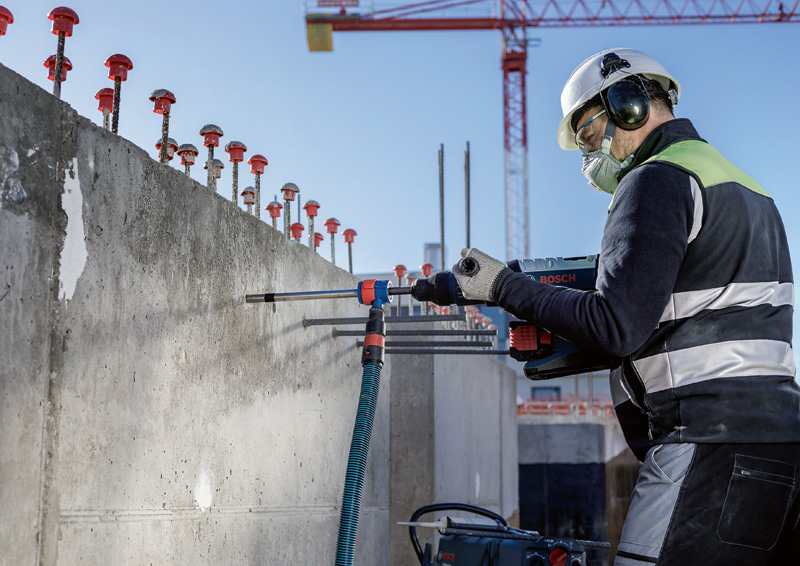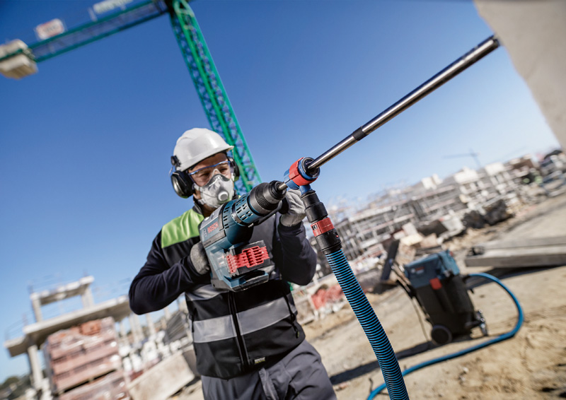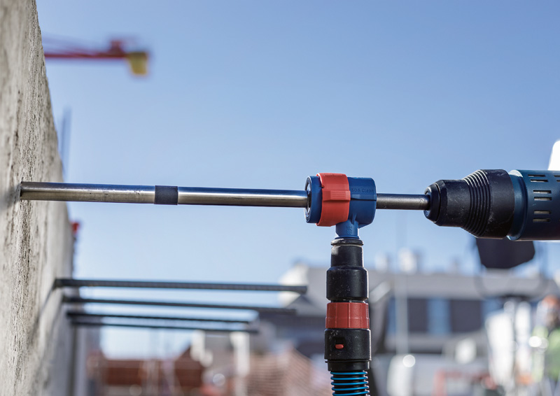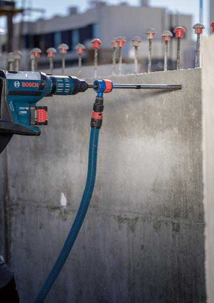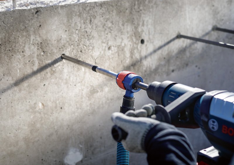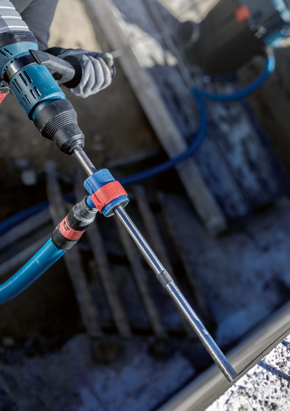 Bohren in Stahlbeton mit verbesserter Staubreduzierung! Durchdringt Stahlbeton mit einem Voll-Carbide-Kopf mit 4 Schneidern Installateure und Bauarbeiter wissen nur zu gut, dass beim Bohren in Beton große Mengen an Staub anfallen. Besonders unangenehm ist dies beim Bohren über Kopf oder beim Bohren und Reinigen für chemische oder mechanische Dübel. Für diese anspruchsvollen Arbeiten haben wir das EXPERT SDS Clean plus-8X Set entwickelt. Mit diesem Set bohrst und entfernst du gleichzeitig Staub und Bohrmehl, sodass mühsame Reinigungsarbeiten entfallen. Mit EXPERT SDS Clean plus-8X Set wird der Staub beseitigt, wenn du über Kopf oder eine ganze Reihe von Löchern für mechanische oder chemische Dübel bohren musst. Der Bohrer ist mit einem Vollhartmetallkopf mit 4 Schneiden und innenliegendem Absaugkanal ausgestattet. Zudem haben wir den SDS Clean plus Anschluss verbaut, der für alle SDS Clean plus-8X Bohrer geeignet ist und sich leicht montieren und abnehmen lässt. Er verbindet die Bohrmaschine mit Staubabsaugungen, sodass Staub und kleines Bohrgut durch den integrierten Absaugkanal aus dem Bohrloch extrahiert werden kann. Die vormontierte Staubkappe unterstützt das Auffangen von Schmutz und Staub, sobald du mit dem Bohren beginnst. Hocheffizienter Abtransport von Staub mit Bosch Particle Control