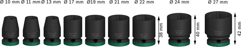 | Impact Socket Set: | 3/8", Standard, 9‑tlg. |