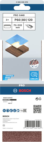 Produktinformationen "Bosch PRO X440 Schleifband, 65 x 410 mm, G60, G80, G100, 3-tlg."