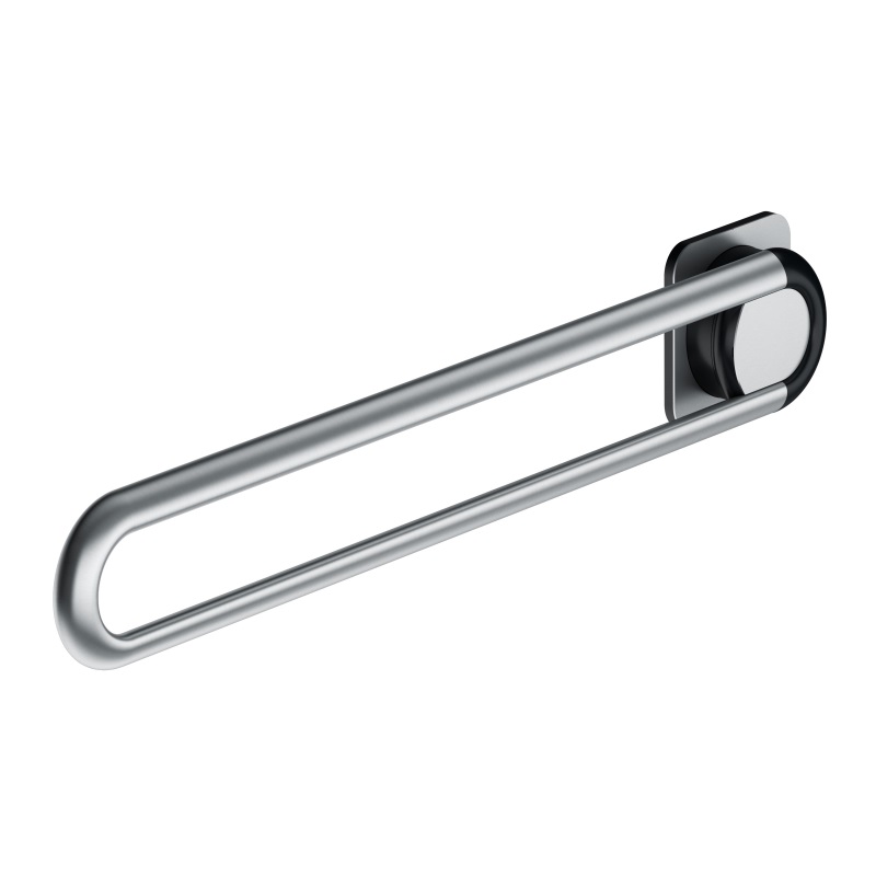 Das elliptische Ovalrohr in 45°-Schrägstellung sorgt für optimales Greifen und Stützen. Die maximale Belastbarkeit von oben an der Vorderkante beträgt 100 kg und die seitliche Belasbarkeitsgrenze liegt bei 60 kg. Dieses Produkt ist dafür gedacht, seitlich an einem Versorgungsschacht o.ä. angebracht zu werden. Geeignet ist es für WC-Becken mit einer Ausladung von 55 mm. Die verdeckte Befestigung des Stützklappgriff erfolgt mittels einer Wandhalterung aus schwarzgrauem Zinkdruckguss (RAL7021).