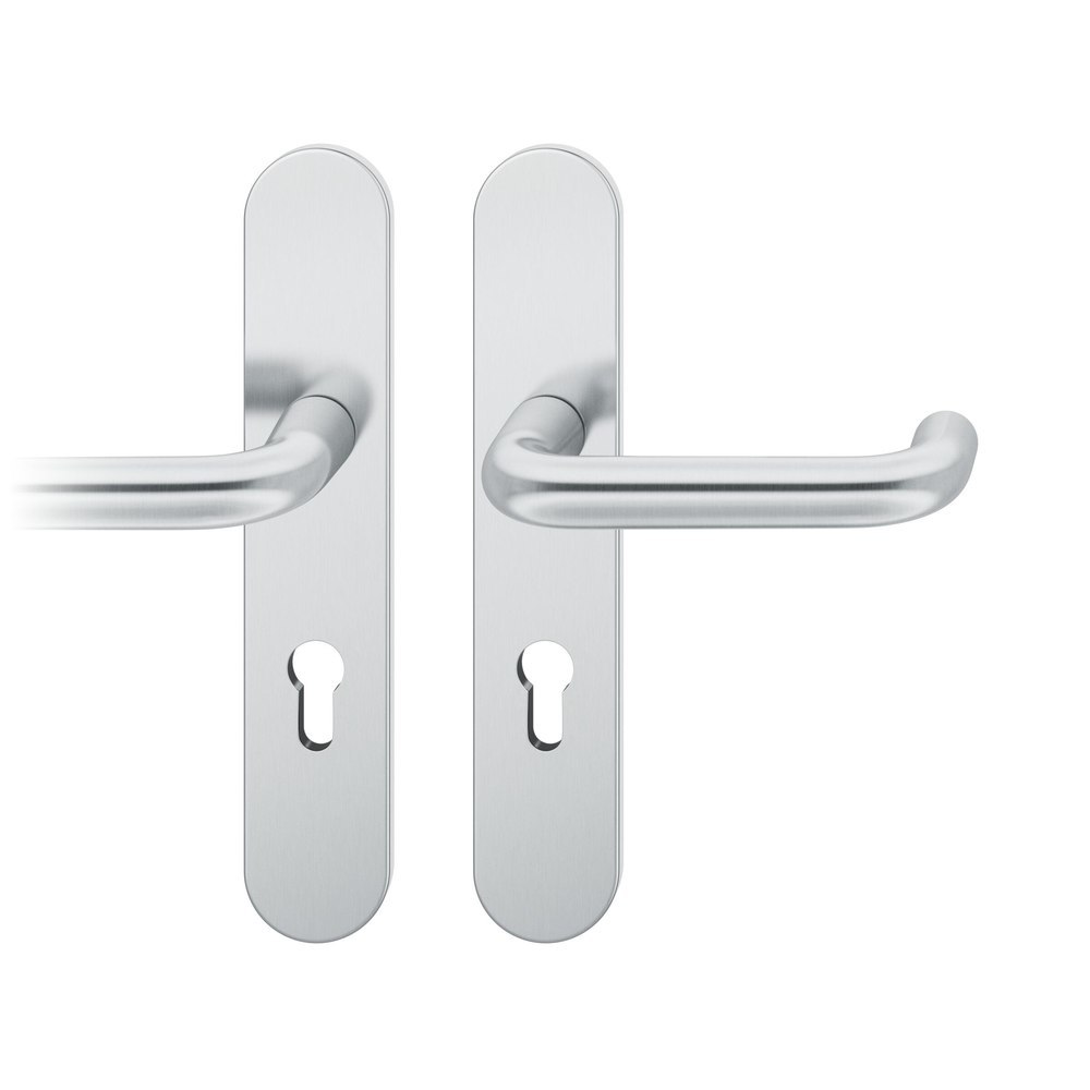 Produktinformationen "FSB Drückergarnitur 12 1070, Langschild, oval, Profilzylinder gelocht, Entfernung 72mm, Vierkant 8mm, DIN Links-Rechts, Türstärke 39 - 58mm, mit Stütznocken, edelstahl fein matt, Adapter-Standardlager"