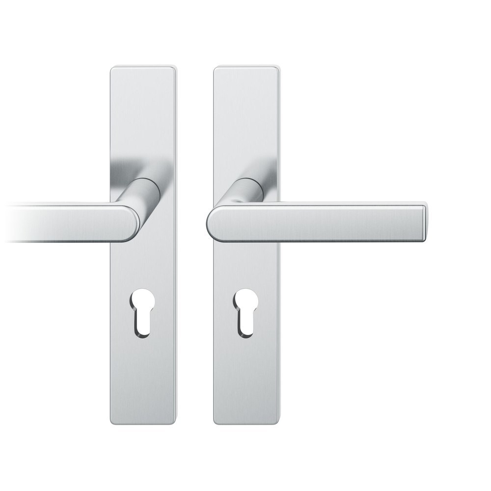 Produktinformationen "FSB Drückergarnitur 72 1244, Langschild, eckig, Profilzylinder gelocht, Entfernung 72mm, Vierkant 8mm, DIN Links, Türstärke 39 - 48mm, mit Stütznocken, edelstahl fein matt, Ausgleichslager® 3"