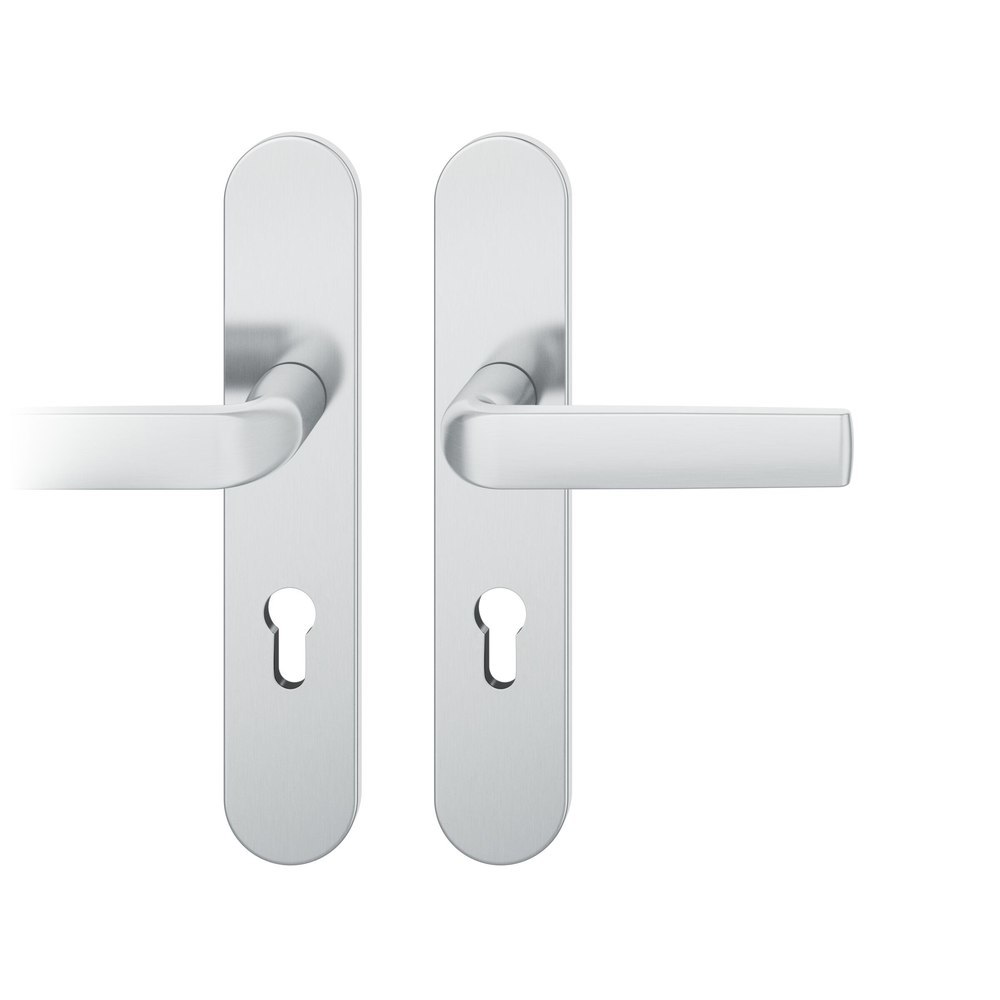 Produktinformationen "FSB Drückergarnitur 72 1267, Langschild, oval, Profilzylinder gelocht, Entfernung 72mm, Vierkant 8mm, DIN Rechts, Türstärke 39 - 48mm, mit Stütznocken, edelstahl fein matt, Ausgleichslager® 3"