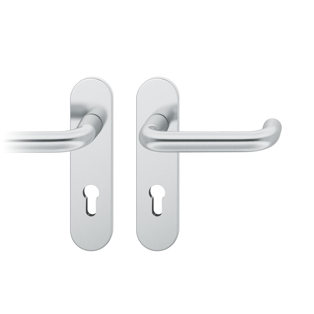 Produktinformationen "FSB Drückergarnitur 12 1070, Kurzschild, oval, Profilzylinder gelocht, Entfernung 72mm, Vierkant 8mm, DIN Links-Rechts, Türstärke 39 - 58mm, mit Stütznocken, edelstahl fein matt, Adapter-Standardlager"