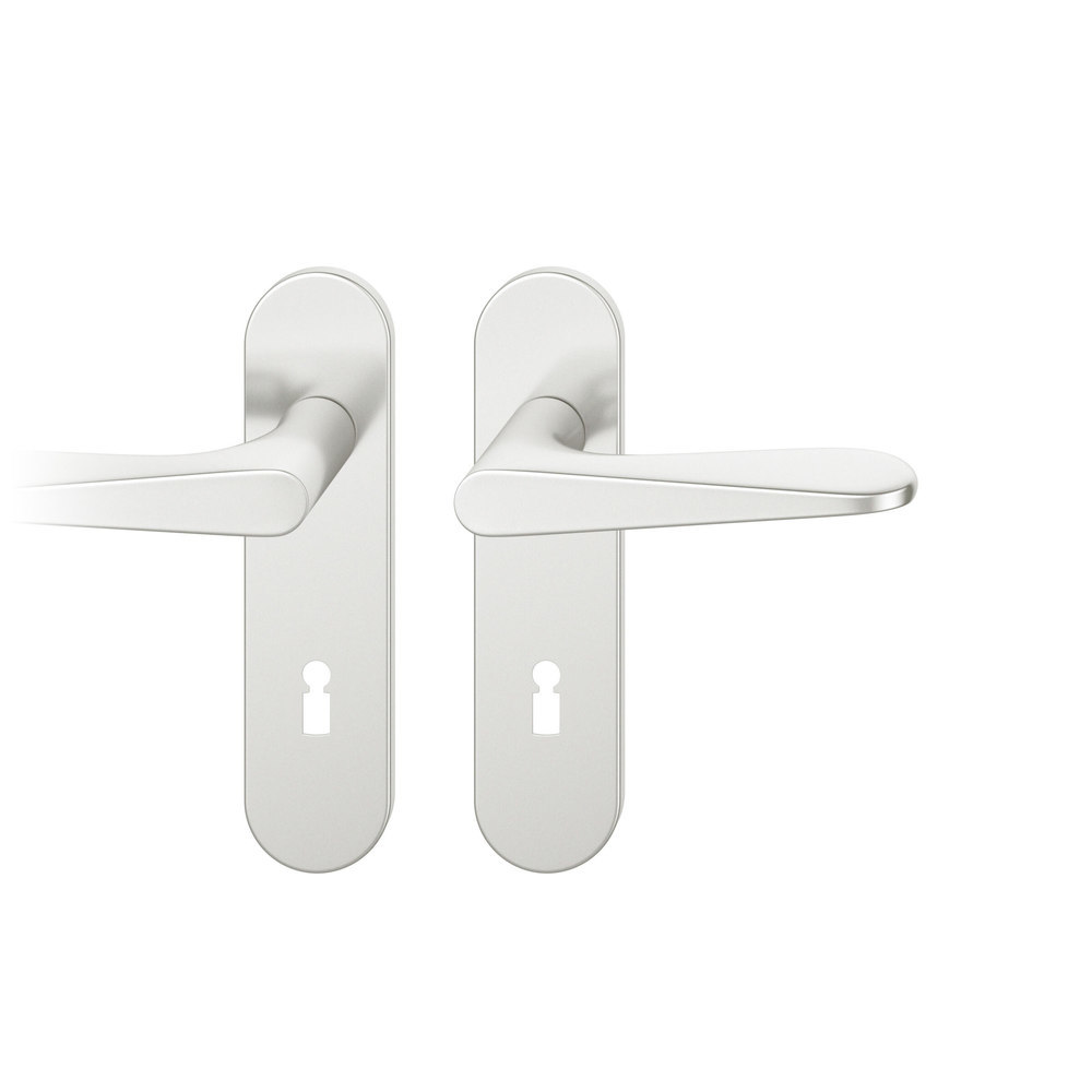 Produktinformationen "FSB Drückergarnitur 12 1144, Kurzschild, oval, Buntbart gelocht, Entfernung 72mm, Vierkant 8mm, DIN Links-Rechts, Türstärke 39 - 58mm, mit Stütznocken, naturfarben eloxiert, Adapter-Standardlager"