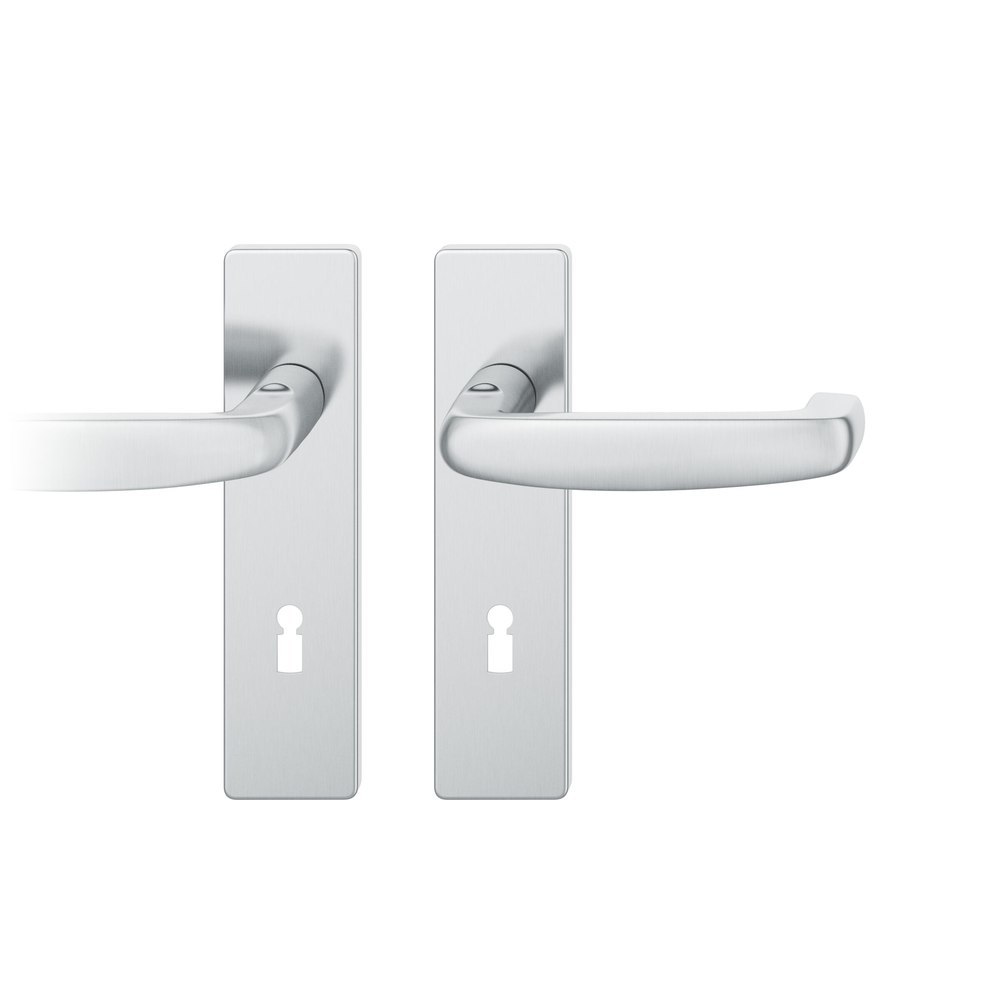 FSB Drückergarnitur 12 1159; Produkttyp: Drückergarnitur; Produkttyp (Hersteller): Drückergarnitur; Ausführung: Kurzschild; Befestigungsart: verdeckt verschraubt; Befestigungstechnik: mit Stütznocken; Form: eckig; Vierkant: 8 mm; Material: Edelstahl; Material Unterkonstruktion: Kunststoff; Form Türgriff (innen): Design; Form Türgriff (außen): Design; Breite Türgriff (innen): 23 mm; Breite Türgriff (außen): 23 mm; Länge Türgriff (innen): 136 mm; Länge Türgriff (außen): 136 mm; Höhe Türgriff (innen): 59 mm; Höhe Türgriff (außen): 59 mm; Schildbreite außen: 45 mm; Schildbreite innen: 45 mm; Schildlänge außen: 185 mm; Schildlänge innen: 185 mm; Schildstärke außen: 7 mm; Schildstärke innen: 7 mm; Lagerung: festdrehbar, Adapter-Standardlager; Einsatzbereich: Zimmertür; Türart: Vollblatt; Türwerkstoff: Stahl, Holz; Norm: DIN EN 1906; Lochung: Buntbart gelocht; Entfernung: 72 mm; DIN-Richtung: DIN Links-Rechts; Farbe: grau; Farbton: edelstahl; Oberfläche: fein matt; Design Türdrücker: Laurids und Manfred Ortner; Ausführung Vierkant: Stabilstift; Betätigungswinkel max.: 45 °; Türstärke min.: 39 mm; Türstärke max.: 58 mm