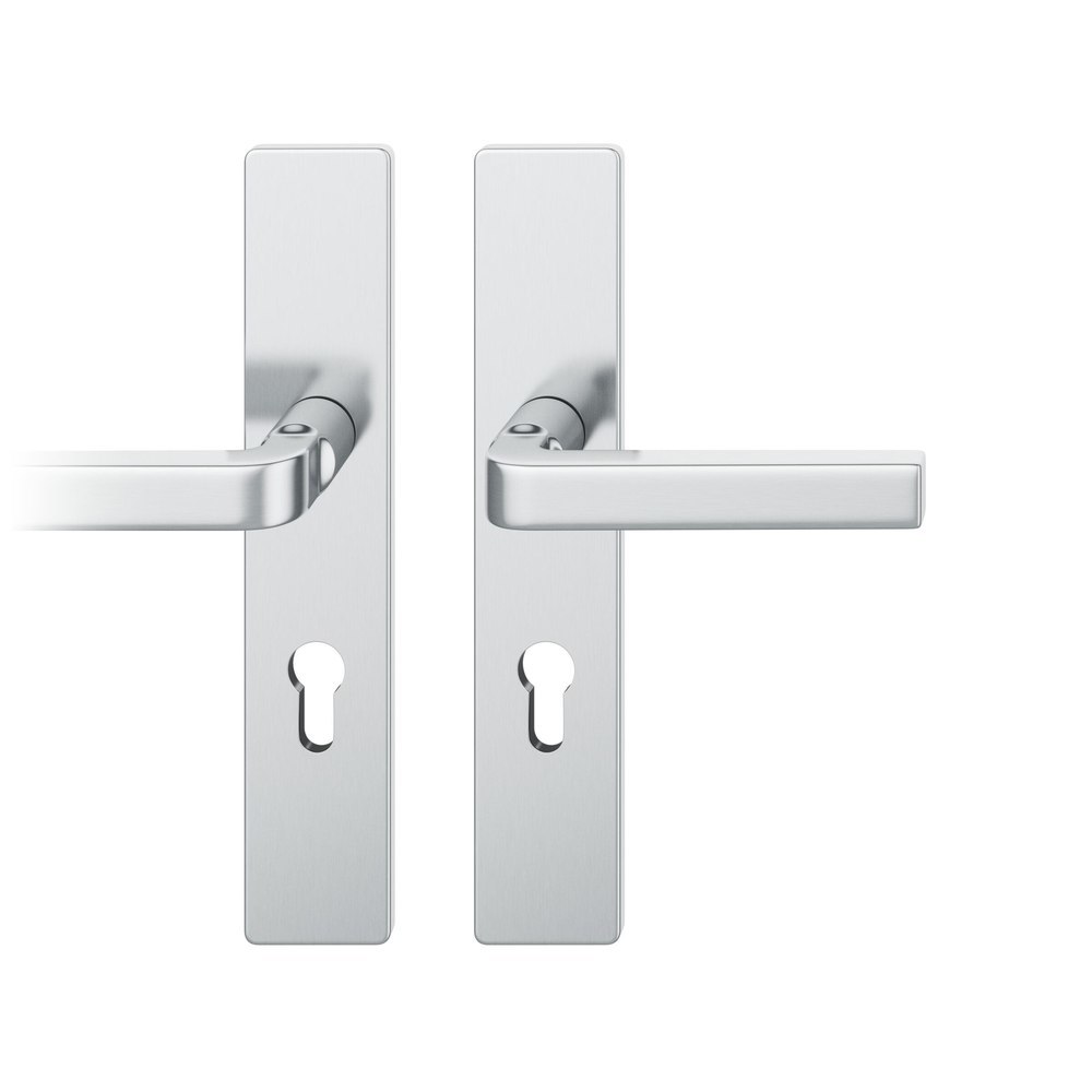 Produktinformationen "FSB Drückergarnitur 12 1004, Langschild, eckig, Profilzylinder gelocht, Entfernung 72mm, Vierkant 8mm, DIN Links-Rechts, Türstärke 39 - 58mm, mit Stütznocken, edelstahl fein matt, Adapter-Standardlager"