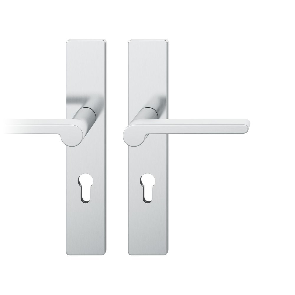 Produktinformationen "FSB Drückergarnitur 12 1021, Langschild, eckig, Profilzylinder gelocht, Entfernung 72mm, Vierkant 8mm, DIN Links-Rechts, Türstärke 39 - 58mm, mit Stütznocken, edelstahl fein matt, Adapter-Standardlager"