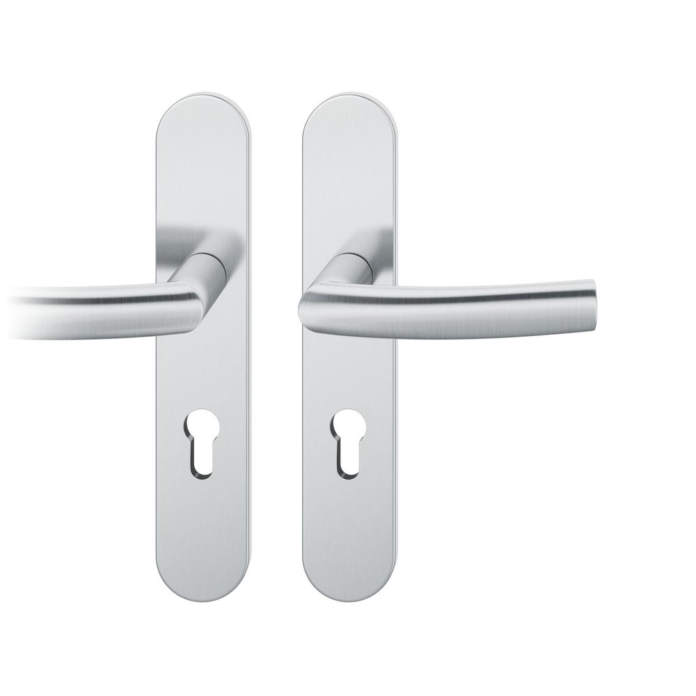 Produktinformationen "FSB Drückergarnitur 72 1107, Langschild, oval, Profilzylinder gelocht, Entfernung 72mm, Vierkant 8mm, DIN Links, Türstärke 39 - 48mm, Befestigungstechnik mit Stütznocken, grau, edelstahl, fein matt, 35°"