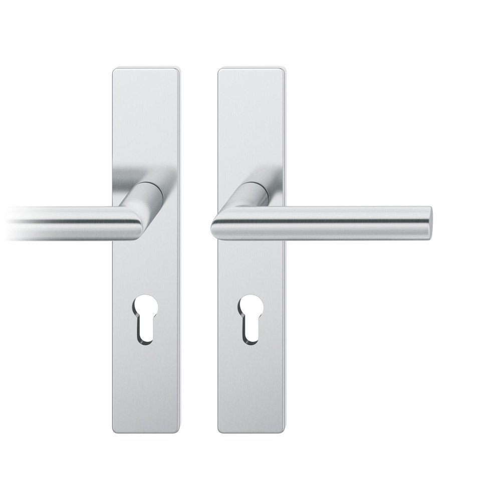 Produktinformationen "FSB für Feuerschutz Drückergarnitur 76 1076, Langschild, eckig, Profilzylinder gelocht, Entfernung 72mm, Vierkant 9mm, DIN Rechts, Türstärke 39 - 48mm, mit Stütznocken, edelstahl fein matt, Ausgleichslager® 3"