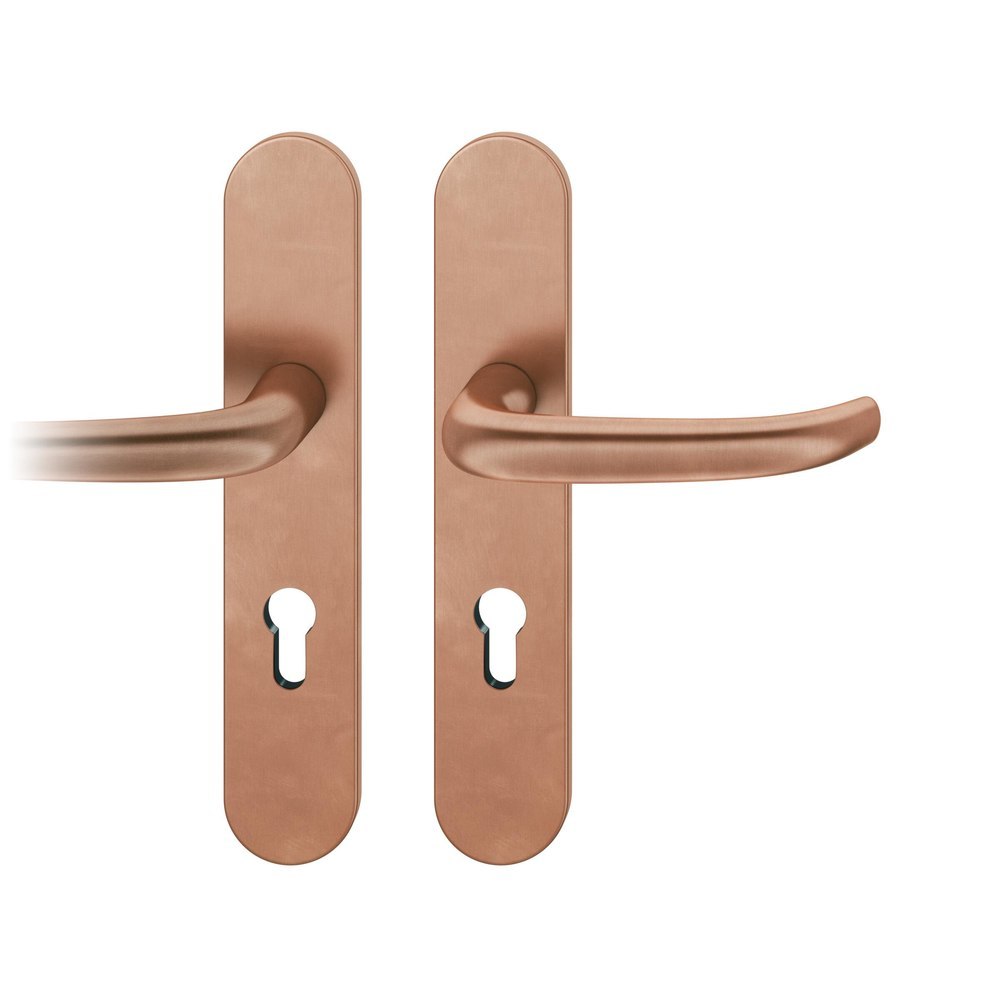 Produktinformationen "FSB für Feuerschutz Drückergarnitur 79 1053, Langschild, oval, Profilzylinder gelocht, Entfernung 72mm, Vierkant 9mm, DIN Rechts, Türstärke 39 - 48mm, mit Stütznocken, hellbronze patiniert gewachst, Ausgleichslager® 3"