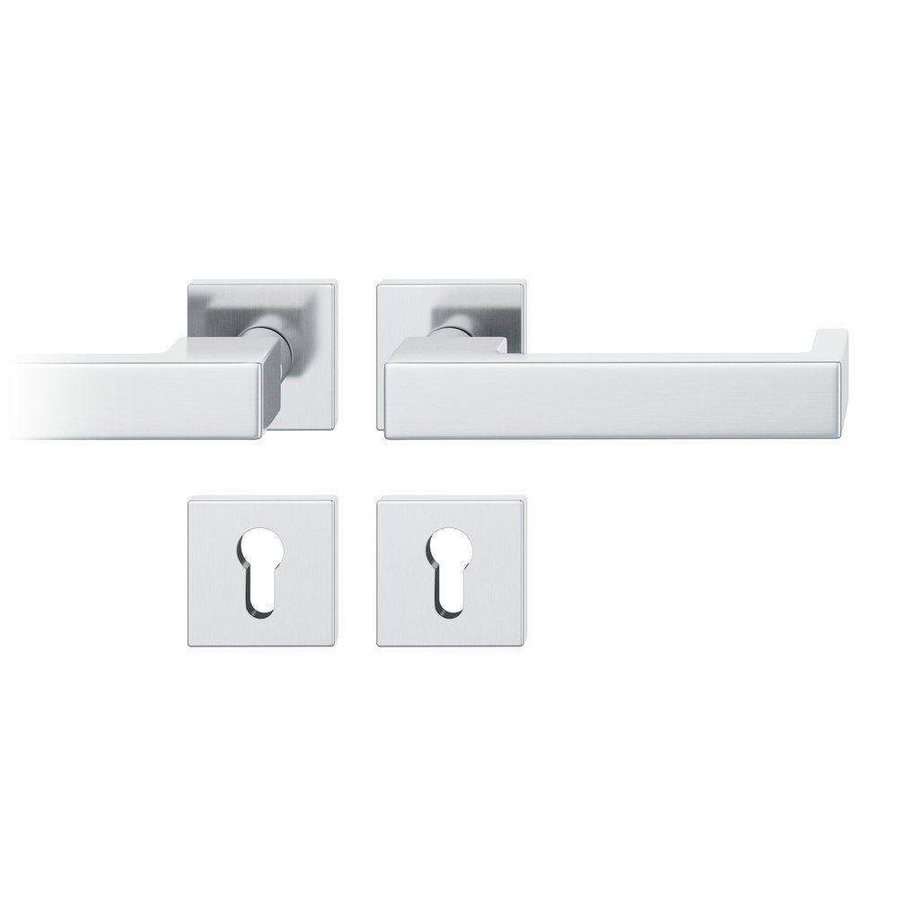 FS-AGL3-Drückergarnitur rechts 9mm PZ quadratische Rosette EN 179. max. 35°. TS 39-48mm Edelstahl fein matt
