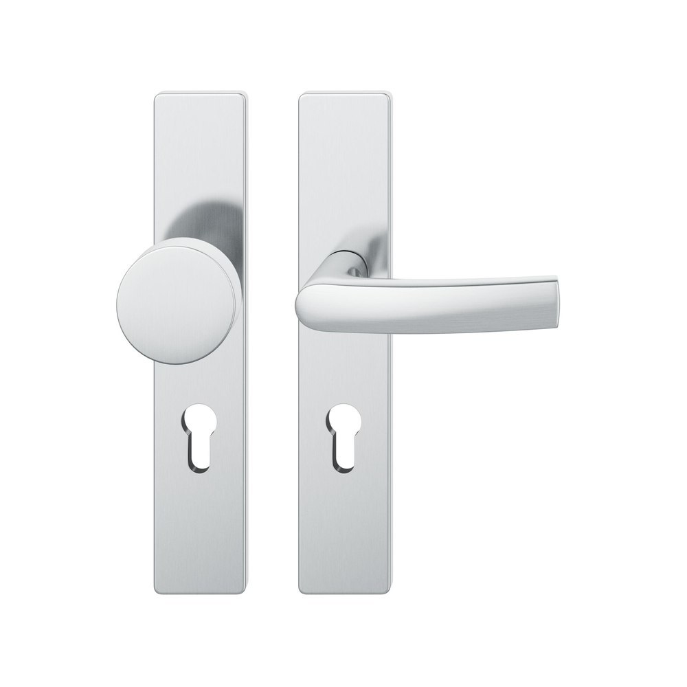 FSB Wechselgarnitur 76 1015; Produkttyp: Wechselgarnitur; Produkttyp (Hersteller): Wechselgarnitur; Ausführung: Langschild; Befestigungsart: verdeckt verschraubt; Befestigungstechnik: mit Stütznocken; Form: eckig; Vierkant: 9 mm; Material: Edelstahl; Form Türgriff (innen): gebogen; Form Türgriff (außen): Flachknopf; Gewinde Knopf/Griffplatte: M12; Durchmesser Türgriff (außen): 55 mm; Länge Türgriff (innen): 122 mm; Höhe Türgriff (innen): 54 mm; Höhe Türgriff (außen): 44 mm; Schildbreite außen: 45 mm; Schildbreite innen: 45 mm; Schildlänge außen: 245 mm; Schildlänge innen: 245 mm; Schildstärke außen: 7 mm; Schildstärke innen: 7 mm; Lagerung: mit Rückholfeder, festdrehbar, Ausgleichslager® 3; Einsatzbereich: Objekttür; Türart: Vollblatt; Türwerkstoff: Holz, Stahl; Norm: DIN EN 1906, DIN 18273; Zulassung: für Feuerschutz, für Rauchschutz; Lochung: Profilzylinder gelocht; Entfernung: 72 mm; DIN-Richtung: DIN Rechts; Farbe: grau; Farbton: edelstahl; Oberfläche: fein matt; Ausführung Vierkant: Rollenwechselstift; Betätigungswinkel max.: 35 °; Türstärke min.: 39 mm; Türstärke max.: 48 mm
