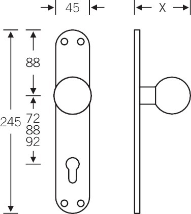 FSB Wohnungseingangstür Knopf, Abdeckung: auf Langschild, Form Abdeckung: oval, Lochung: Profilzylinder gelocht, Entfernung: 72 mm, Vierkant: 8 mm, Modellnummer: 19 1927, Material: aluminium, Farbton: naturfarbig, Oberfläche: eloxiert, Befestigungsart: sichtbar verschraubt, Befestigungstechnik: ohne Stütznocken, Befestigungssystem: Stiftverbindung, Schildstärke: 7 mm, DIN-Richtung: DIN Links-Rechts, Knopfbefestigung: Stabil-Wechselstift mit Rolle, Lagerung: fest, Türart: Außentüren, Türwerkstoff: Holz, stahl, Länge: 245 mm, Breite: 45 mm, Knopfform: Kugelform, Knopfdurchmesser: 50 mm, Knopfhöhe: 70 mm, Rollengewinde: M12