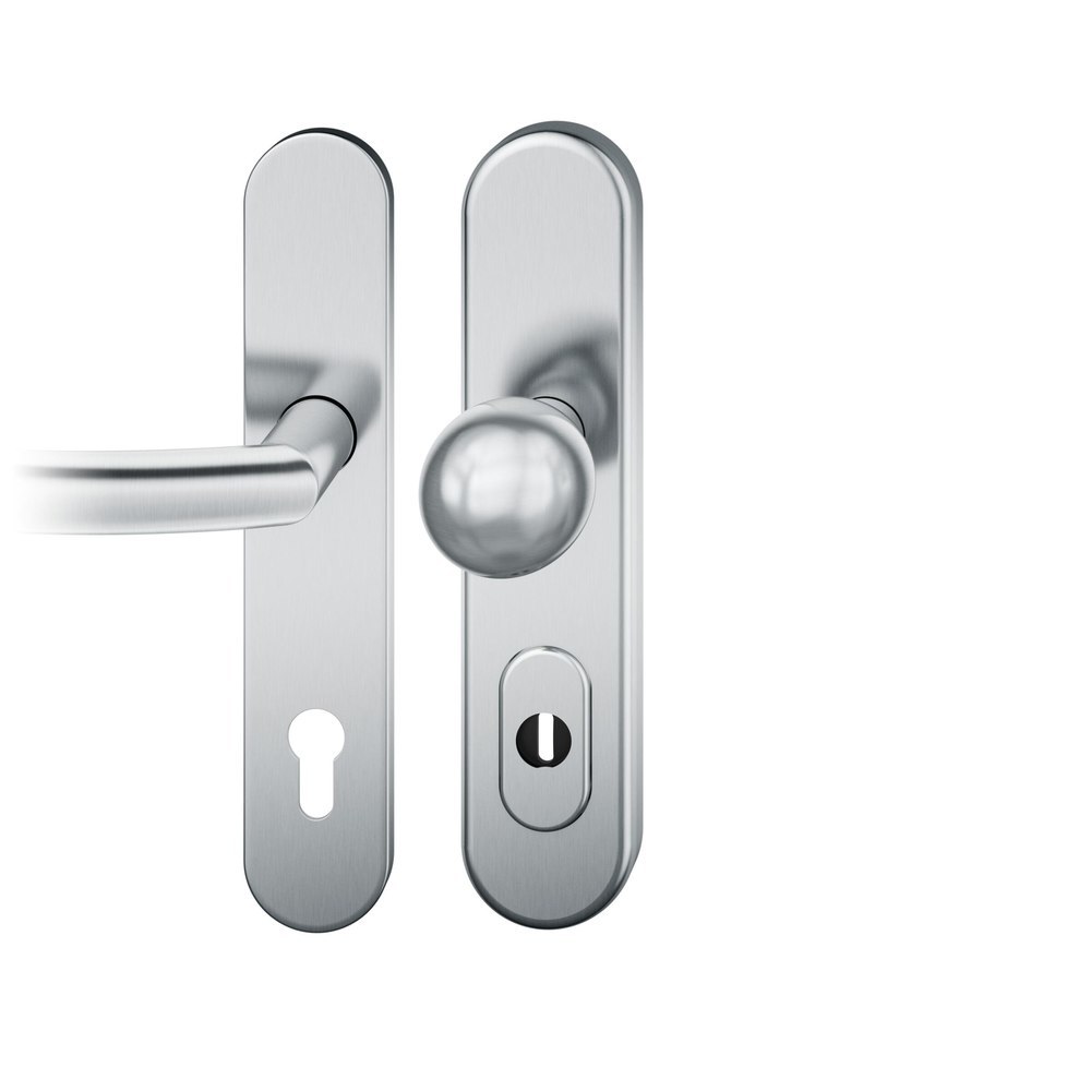 FSB Sicherheits-Wechselgarnitur 73 7375; Produkttyp: Sicherheits-Wechselgarnitur; Produkttyp (Hersteller): Wechselgarnitur; Ausführung: Langschild; Form: oval; Material: Edelstahl; Form Türgriff (innen): gebogen; Form Türgriff (außen): Kugelknopf; Gewinde Knopf/Griffplatte: M12; Länge Türgriff (innen): 136 mm; Höhe Türgriff (innen): 59 mm; Höhe Türgriff (außen): 65 mm; Durchmesser Türgriff (außen): 50 mm; Einsatzbereich: Haustür; Türart: Vollblatt; Türwerkstoff: Stahl,Holz; Zylinderabdeckung: mit Zylinderabdeckung; DIN-Richtung: DIN Links-Rechts; Widerstandsklasse nach DIN 18257: ES 1; Vierkant: 10 mm; Entfernung: 92 mm; Lochung: Profilzylinder gelocht; Ausführung Vierkant: Rollenwechselstift; Farbe: grau; Farbton: edelstahl; Oberfläche: fein matt; Schildlänge außen: 246 mm; Schildlänge innen: 245 mm; Schildbreite außen: 54 mm; Schildbreite innen: 45 mm; Schildstärke innen: 7 mm; Schildstärke außen: 15 mm; Zylinderüberstand min.: 8 mm; Zylinderüberstand max.: 15 mm; Türstärke min.: 67 mm; Türstärke max.: 69 mm; Norm: DIN 18257,DIN EN 1906