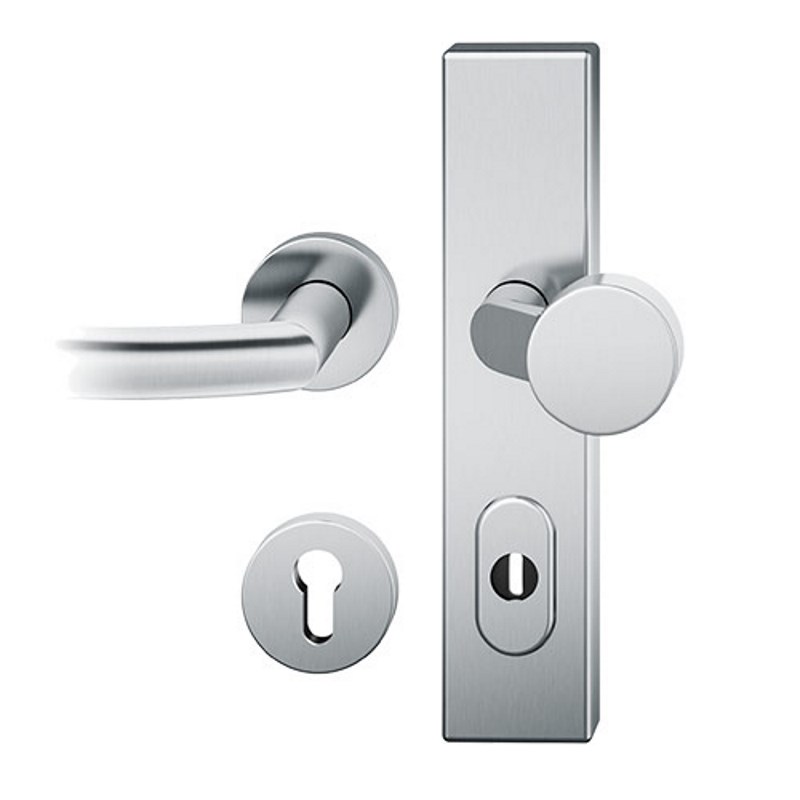 Der FSB 7379 Türgriff ist als Schutzgarnitur konzipiert. Die Schutzgarnitur ist wahlweise in Edelstahl, Aluminium oder Bronze erhältlich. Dank des Zylinderziehschutzes eignet sich der FSB 7379 besonders zum Einsatz an Haus- und Wohnungseingangstüren und entspricht der Schutzklasse 2. Der Zylinderziehschutz ist für Zylinderüberstände von 8-15 mm ausgelegt.