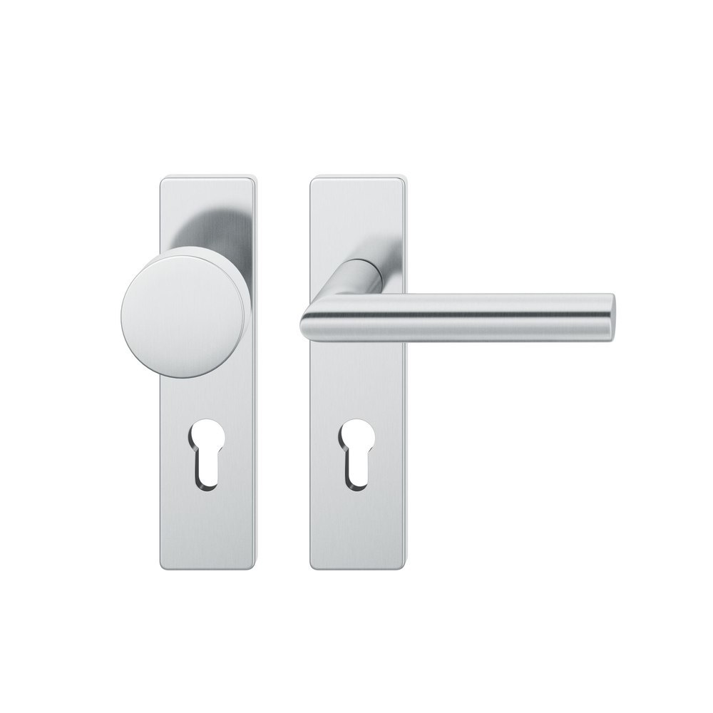 FSB Wechselgarnitur 72 1076; Produkttyp: Wechselgarnitur; Produkttyp (Hersteller): Wechselgarnitur; Ausführung: Kurzschild; Befestigungsart: verdeckt verschraubt; Befestigungstechnik: mit Stütznocken; Form: eckig; Vierkant: 8 mm; Material: Edelstahl; Form Türgriff (innen): L-Form; Form Türgriff (außen): Flachknopf; Gewinde Knopf/Griffplatte: M12; Durchmesser Türgriff (innen): 21 mm; Durchmesser Türgriff (außen): 55 mm; Länge Türgriff (innen): 137 mm; Höhe Türgriff (innen): 58 mm; Höhe Türgriff (außen): 44 mm; Schildbreite außen: 45 mm; Schildbreite innen: 45 mm; Schildlänge außen: 185 mm; Schildlänge innen: 185 mm; Schildstärke außen: 7 mm; Schildstärke innen: 7 mm; Lagerung: festdrehbar, Ausgleichslager® 3, mit Rückholfeder; Einsatzbereich: Zimmertür; Türart: Vollblatt; Türwerkstoff: Stahl, Holz; Norm: DIN EN 1906; Lochung: Profilzylinder gelocht; Entfernung: 72 mm; DIN-Richtung: DIN Links; Farbe: grau; Farbton: edelstahl; Oberfläche: fein matt; Ausführung Vierkant: Rollenwechselstift; Betätigungswinkel max.: 35 °; Türstärke min.: 39 mm; Türstärke max.: 48 mm