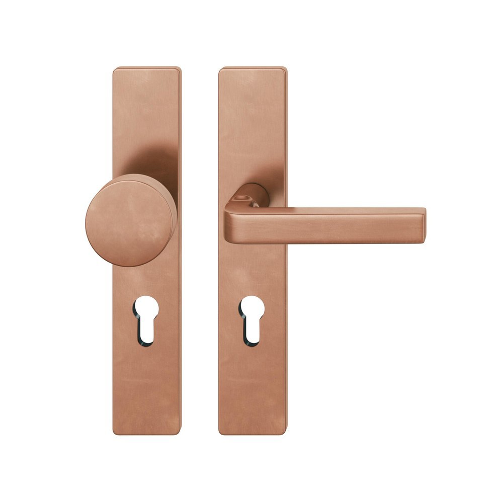 FSB Wechselgarnitur 72 1004; Produkttyp: Wechselgarnitur; Produkttyp (Hersteller): Wechselgarnitur; Ausführung: Langschild; Befestigungsart: verdeckt verschraubt; Befestigungstechnik: mit Stütznocken; Form: eckig; Vierkant: 8 mm; Material: Bronze; Form Türgriff (innen): L-Form; Form Türgriff (außen): Flachknopf; Gewinde Knopf/Griffplatte: M12; Durchmesser Türgriff (außen): 50 mm; Länge Türgriff (innen): 133 mm; Höhe Türgriff (innen): 57 mm; Höhe Türgriff (außen): 44 mm; Schildbreite außen: 45 mm; Schildbreite innen: 45 mm; Schildlänge außen: 245 mm; Schildlänge innen: 245 mm; Schildstärke außen: 7 mm; Schildstärke innen: 7 mm; Lagerung: festdrehbar, mit Rückholfeder, Ausgleichslager® 3; Einsatzbereich: Zimmertür; Türart: Vollblatt; Türwerkstoff: Holz, Stahl; Norm: DIN EN 1906; Lochung: Profilzylinder gelocht; Entfernung: 72 mm; DIN-Richtung: DIN Rechts; Farbe: braun; Farbton: hellbronze; Oberfläche: patiniert gewachst; Design Türdrücker: David Chipperfield; Ausführung Vierkant: Rollenwechselstift; Betätigungswinkel max.: 35 °; Türstärke min.: 39 mm; Türstärke max.: 48 mm
