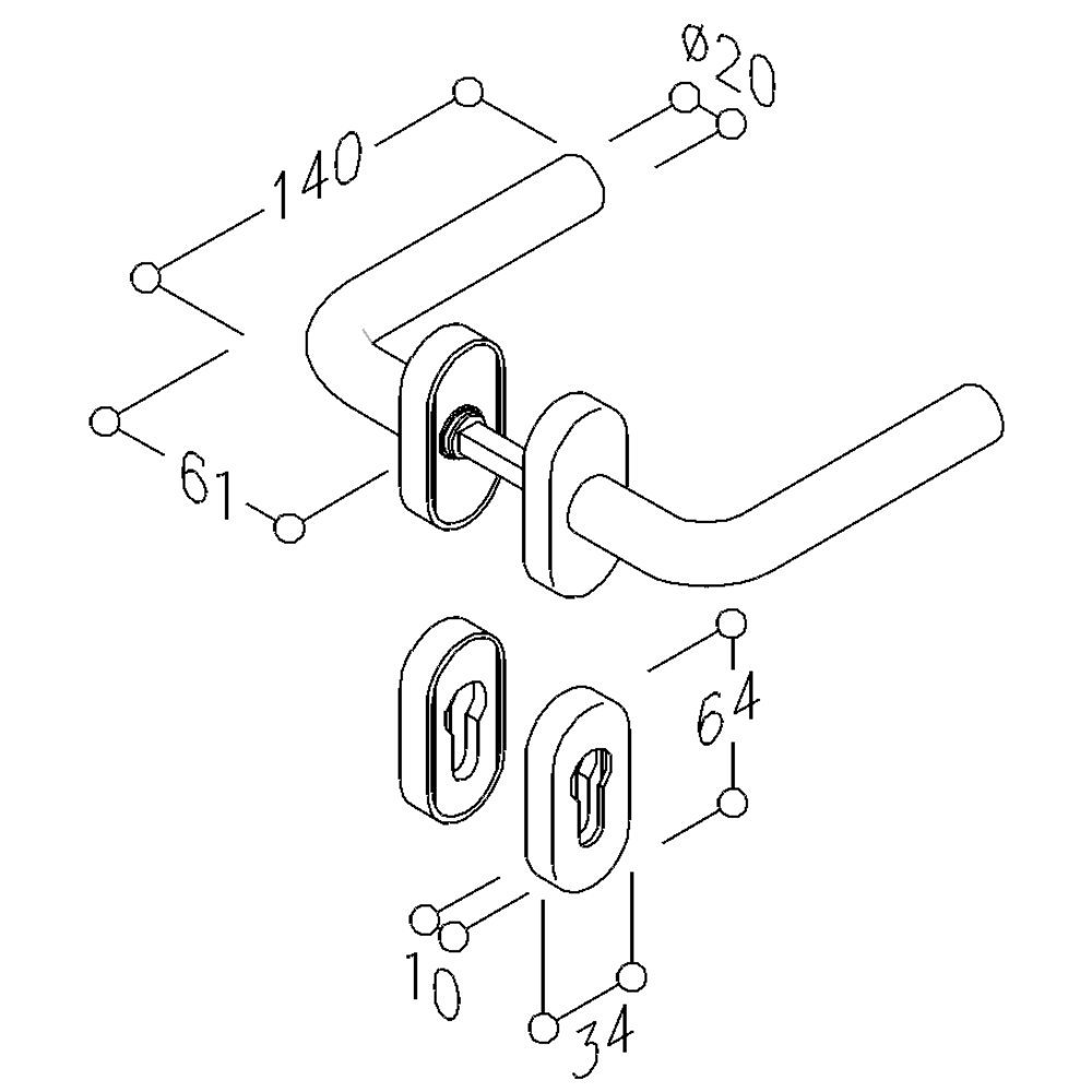 HELO Profiltür Drückergarnitur, Abdeckung: mit Rosetten, Modell: EST.ZG, Modellnummer: 51, Lochung: Profilzylinder gelocht, Vierkant: 8, Material: edelstahl, Farbton: edelstahl, Oberfläche: fein matt, DIN-Richtung: DIN Links-Rechts, Lagerung: Gleitlager, wartungsfrei, festdrehbar, Befestigungstechnik: ohne Stütznocken, Befestigungsart: verdeckt verschraubt, Befestigungssystem: Stiftverbindung, Material Unterkonstruktion: Kunststoff-Stahlverbundbau, Länge: 64 mm, Breite: 34 mm, Anschlagrichtung: Drücker rechts/links verwendbar, Drückerbefestigung: Vierkantstift, Drückerform: L-Form, Drückerdurchmesser: 20 mm, Drückerlänge: 140 mm, Drückerhöhe: 51 mm, Form: oval, Stärke Abdeckung: 10 mm, Türstärke min.: 60 mm, Türstärke max.: 65 mm, Türart: Rahmentüren, Türwerkstoff: aluminium, Kunststoff, Benutzerklasse: Klasse 4, Norm: DIN EN 1906, DIN 18255
