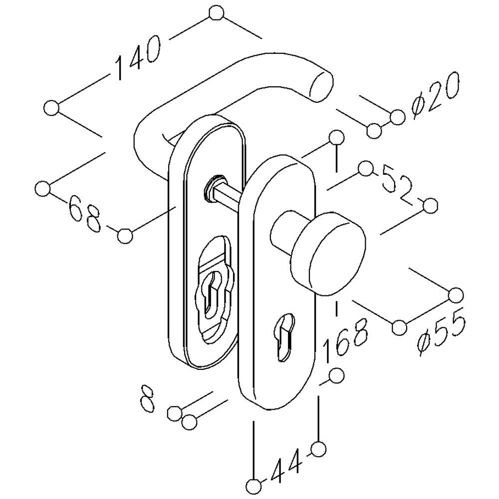 HELO feuerhemmend Wechselgarnitur, Abdeckung: Kurzschild, Modell: EST.WG, Modellnummer: FS 41/K5, Lochung: Profilzylinder gelocht, Entfernung: 72 mm, Vierkant: 9, Material: edelstahl, Farbton: edelstahl, Oberfläche: fein matt, DIN-Richtung: DIN Links-Rechts, Lagerung: festdrehbar, wartungsfreies Gleitlager, Befestigungsart: verdeckt verschraubt, Befestigungstechnik: mit Stütznocken, Material Unterkonstruktion: Kunststoff-Stahlverbundbau, Befestigungssystem: Stiftverbindung, Drückerform: U-Form, Drückerdurchmesser: 20 mm, Drückerhöhe: 60 mm, Drückerlänge: 140 mm, Eigenschaft: Knopf fest auf Schild, Länge: 168 mm, Breite: 44 mm, Knopfform: rund, Knopfdurchmesser: 55 mm, Knopfhöhe: 45 mm, Anschlagrichtung: Drücker rechts/links verwendbar, Drückerbefestigung: Wechselstift, Form: oval, Schildstärke außen: 10 mm, Schildstärke innen: 10 mm, Türstärke min.: 45 mm, Türstärke max.: 54 mm, Türart: Außentüren, Türwerkstoff: Holz, stahl, Benutzerklasse: Klasse 4, Norm: DIN 18273, DIN 18255, DIN EN 1906, Zulassung: für Feuerschutz, für Rauchschutz