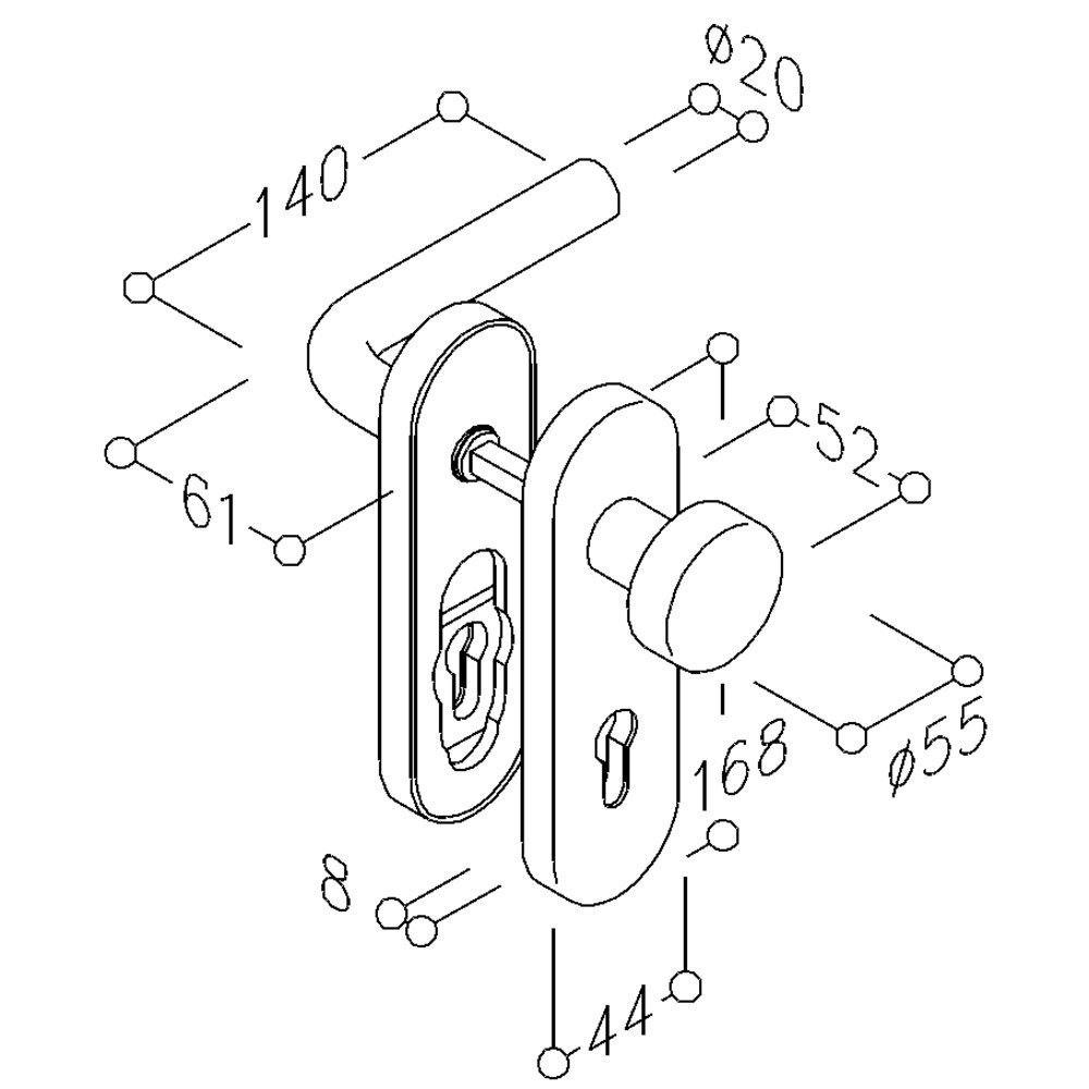 HELO feuerhemmend Wechselgarnitur, Abdeckung: Kurzschild, Modell: EST.WG, Modellnummer: FS 51/K5, Lochung: Profilzylinder gelocht, Entfernung: 72 mm, Vierkant: 9, Material: edelstahl, Farbton: edelstahl, Oberfläche: fein matt, DIN-Richtung: DIN Links-Rechts, Lagerung: festdrehbar, wartungsfreies Gleitlager, Befestigungsart: verdeckt verschraubt, Befestigungstechnik: mit Stütznocken, Material Unterkonstruktion: Kunststoff-Stahlverbundbau, Befestigungssystem: Stiftverbindung, Drückerform: L-Form, Drückerdurchmesser: 20 mm, Drückerhöhe: 53 mm, Drückerlänge: 140 mm, Eigenschaft: Knopf fest auf Schild, Länge: 168 mm, Breite: 44 mm, Knopfform: rund, Knopfdurchmesser: 55 mm, Knopfhöhe: 45 mm, Anschlagrichtung: Drücker rechts/links verwendbar, Drückerbefestigung: Wechselstift, Form: oval, Schildstärke außen: 10 mm, Schildstärke innen: 10 mm, Türstärke min.: 45 mm, Türstärke max.: 54 mm, Türart: Außentüren, Türwerkstoff: Holz, stahl, Benutzerklasse: Klasse 4, Norm: DIN 18273, DIN 18255, DIN EN 1906, Zulassung: für Feuerschutz, für Rauchschutz