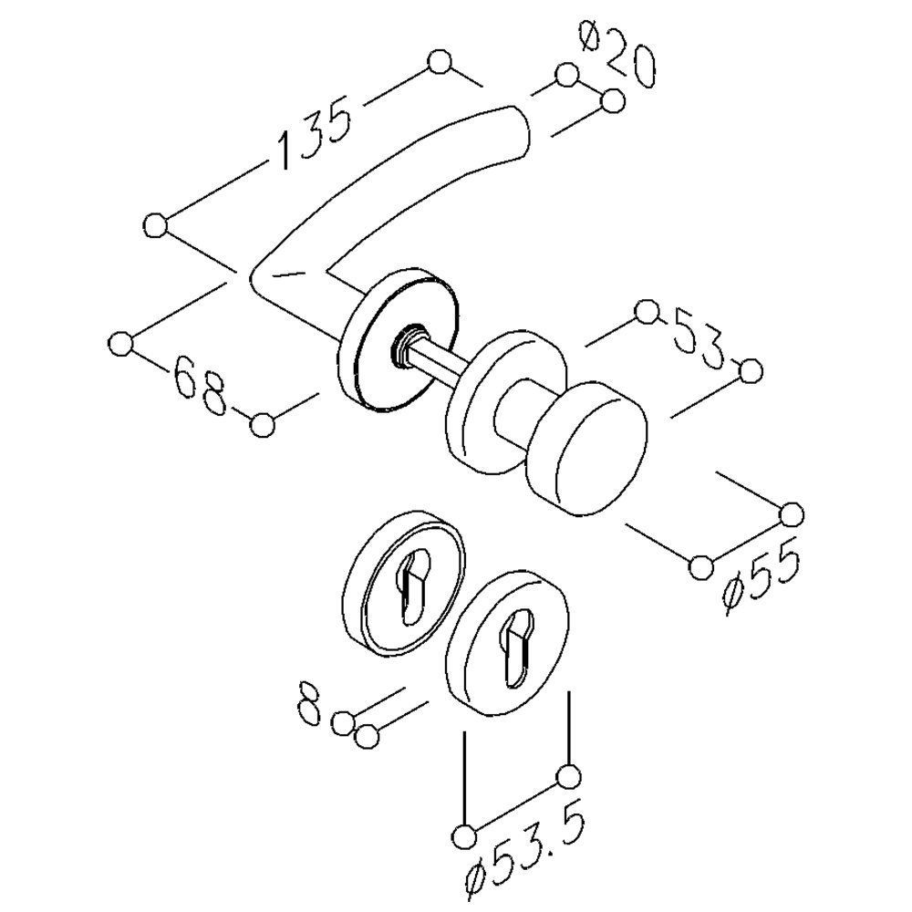 HELO, Objekttür-Wechselgarnitur, Abdeckung: mit Rosetten, Lochung: Profilzylinder gelocht, Vierkant: 8 mm, Modell: EST.WG, Modellnummer: 31/K5, Material: Edelstahl, Farbton: edelstahl, Oberfläche: fein matt, DIN-Richtung: DIN Links, Befestigungsart: verdeckt verschraubt, Befestigungstechnik: mit Stütznocken, Benutzerklasse: Klasse 4, Stärke Abdeckung außen: 8 mm, Stärke Abdeckung innen: 8 mm, Türstärke min.: 35 mm, Türstärke max.: 44 mm, Befestigungssystem: Stiftverbindung, Form: rund, Lagerung: Gleitlager, wartungsfrei, festdrehbar, Durchmesser: 53,5 mm, Türart: Außentüren, Türwerkstoff: Holz, Stahl, Drückerbefestigung: Wechselstift, Drückerform: gebogen, Drückerdurchmesser: 20 mm, Drückerlänge: 135 mm, Drückerhöhe: 60 mm, Eigenschaft: Knopf fest auf Rosette, Knopfform: rund, Knopfdurchmesser: 55 mm, Knopfhöhe: 45 mm, Norm: DIN 18255, DIN EN 1906, Zusatzinformation: mit beschichteten Hülsenschrauben