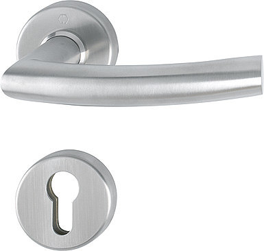 Halbgarnitur Trondheim E1430Z/42/42S; Produkttyp: Halbgarnitur; Produkttyp (Hersteller): Halbgarnitur; Ausführung: Rosette; Befestigungsart Drückerrosette (innen): verdeckt verschraubt; Befestigungsart Schlüsselrosette (innen): verdeckt verschraubt; Befestigungstechnik: mit Stütznocken; Montageart: aufliegend; Form Drückerrosette: rund; Form Schlüsselrosette (innen): rund; Vierkant: 8 mm; Material: Edelstahl; Form Türgriff (innen): gebogen,Gehrung; Durchmesser Türgriff (innen): 20 mm; Durchmesser Schlüsselrosette: 52 mm; Länge Türgriff (innen): 137 mm; Höhe Türgriff (innen): 65 mm; Durchmesser Drückerrosette (innen): 52 mm; Höhe Drückerrosette (innen): 8 mm; Höhe Schlüsselrosette (innen): 8 mm; Lagerung: wartungsfreies Gleitlager; Einsatzbereich: Zimmertür; Türart: Vollblatt; Türwerkstoff: Stahl,Holz; Anwendung: innen; Lochung: Profilzylinder gelocht; DIN-Richtung: DIN Links-Rechts; Farbe: grau; Farbton: edelstahl matt; Ausführung Vierkant: ohne Stift