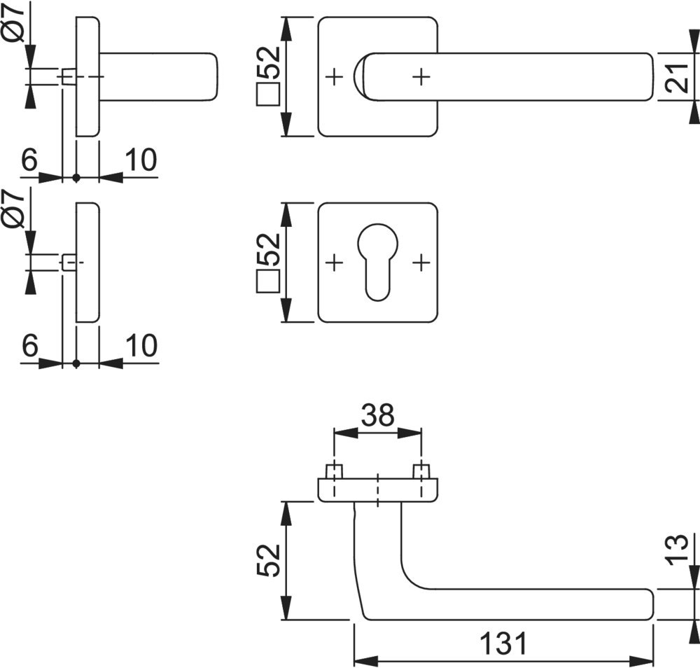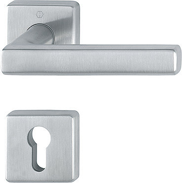 Drückergarnitur Dallas E1643/52/52KVS; Produkttyp: Drückergarnitur; Produkttyp (Hersteller): Drückergarnitur; Ausführung: Rosette; Befestigungsart Drückerrosette (außen): verdeckt verschraubt; Befestigungsart Drückerrosette (innen): verdeckt verschraubt; Befestigungsart Schlüsselrosette (außen): verdeckt verschraubt; Befestigungsart Schlüsselrosette (innen): verdeckt verschraubt; Befestigungstechnik: mit Stütznocken; Montageart: aufliegend; Form Drückerrosette: eckig; Form Schlüsselrosette (außen): eckig; Form Schlüsselrosette (innen): eckig; Vierkant: 8 mm; Material: Edelstahl; Material Unterkonstruktion (Griffrosette): Stahl; Form Türgriff (innen): L-Form; Form Türgriff (außen): L-Form; Breite Türgriff (innen): 21 mm; Breite Türgriff (außen): 21 mm; Länge Türgriff (innen): 131 mm; Länge Türgriff (außen): 131 mm; Höhe Türgriff (innen): 52 mm; Höhe Türgriff (außen): 52 mm; Breite Drückerrosette (außen): 52 mm; Breite Drückerrosette (innen): 52 mm; Länge Drückerrosette (außen): 52 mm; Länge Drückerrosette (innen): 52 mm; Höhe Drückerrosette (außen): 10 mm; Höhe Drückerrosette (innen): 10 mm; Breite Schlüsselrosette (außen): 52 mm; Breite Schlüsselrosette (innen): 52 mm; Höhe Schlüsselrosette (außen): 10 mm; Höhe Schlüsselrosette (innen): 10 mm; Lagerung: wartungsfreies Gleitlager,mit Rückholfeder,festdrehbar; Einsatzbereich: Objekttür; Türart: Vollblatt; Türwerkstoff: Stahl,Holz; Lochung: Profilzylinder gelocht; DIN-Richtung: DIN Links-Rechts; Farbe: grau; Farbton: edelstahl matt; Material Unterkonstruktion (Schlüsselrosette): Kunststoff; Ausführung Vierkant: Profilvollstift; Türstärke min.: 40 mm; Türstärke max.: 45 mm; Norm: DIN EN 1906; EN 1906 - Gebrauchskategorie: Klasse 4; EN 1906 - Korrosionsbeständigkeit: Klasse 5; Klassifizierungsschlüssel EN 1906: 47*-0150A