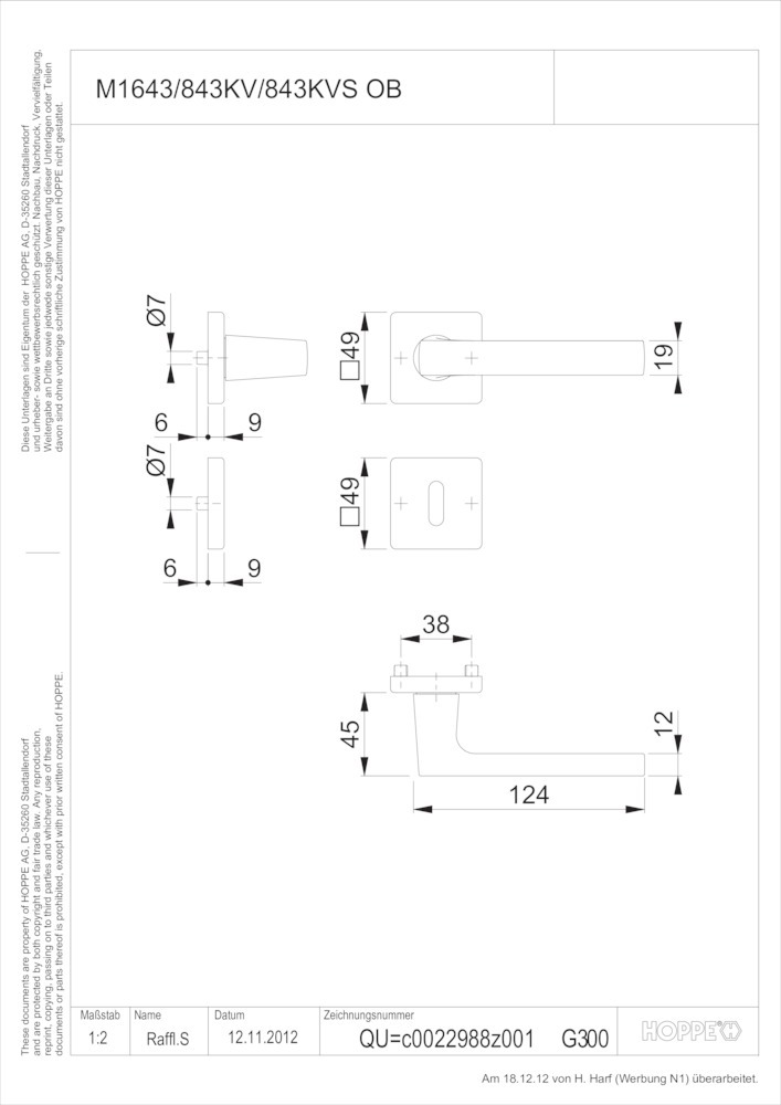 HOPPE®, Objekttür-Drückergarnitur, Abdeckung: mit Rosetten, Modell: Dallas, Modellnummer: M1643/843KV/843KVS, Lochung: Buntbart gelocht, Vierkant: 8mm, Material: Messing, Farbton: kupferfarben satiniert-Resista®, DIN-Richtung: DIN Links-Rechts, Lagerung: Gleitlager, wartungsfrei, Rückholfeder, lose, Befestigungstechnik: mit Stütznocken, Befestigungsart: verdeckt verschraubt, Befestigungssystem: Schnellstiftverbindung, Material Unterkonstruktion: Kunststoff, Länge: 49mm, Breite: 49mm, Anschlagrichtung: Drücker rechts/links verwendbar, Lieferung: mit Ausgleichshülse von 8 auf 8,5 mm, Drückerbefestigung: Vollstift, Drückerform: L-Form, Drückerbreite: 19mm, Drückerlänge: 124mm, Drückerhöhe: 45mm, Form: eckig, Stärke Abdeckung: 9mm, Türstärke min.: 37mm, Türstärke max.: 42mm, Türart: Innentüren, Türwerkstoff: Holz, Stahl, Benutzerklasse: Klasse 3, Norm: DIN EN 1906