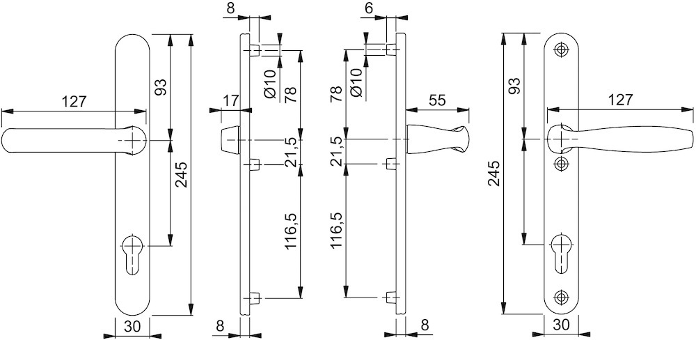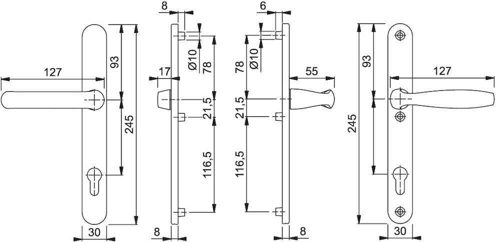 HOPPE®, Profiltür-Drückergarnitur, Abdeckung: Schmalschild, Lochung: Profilzylinder gelocht, Entfernung: 92mm, Vierkant: 8mm, Material: Aluminium, Farbton: naturfarbig, Oberfläche: eloxiert, Modell: New York, Modellnummer: 099KH/3346/1810, DIN-Richtung: DIN Links-Rechts, Lagerung: Gleitlager, wartungsfrei, festdrehbar, Befestigungstechnik: mit Stütznocken, Befestigungsart: innen sichtbar verschraubt, Befestigungssystem: Stiftverbindung, Material Unterkonstruktion: Edelstahl, Länge: 245mm, Breite: 30mm, Schildstärke: 8mm, Anschlagrichtung: Drücker rechts/links verwendbar, Drückerbefestigung: Vollstift, Form: oval, Drückerform außen: gerade, Drückerform innen: gebogen, Drückerlänge innen: 127 mm, Drückerlänge außen: 127 mm, Drückerhöhe innen: 55 mm, Drückerhöhe außen: 17 mm, Türstärke min.: 67mm, Türstärke max.: 72mm, Türart: Außentüren, Rahmentüren, Türwerkstoff: Aluminium, Kunststoff, Norm: DIN EN 1906