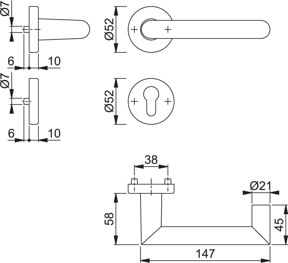 Drückergarnitur Rotterdam 1401/42H/42HKVS; Produkttyp: Drückergarnitur; Produkttyp (Hersteller): Drückergarnitur; Ausführung: Rosette; Befestigungsart Drückerrosette (außen): verdeckt verschraubt; Befestigungsart Drückerrosette (innen): verdeckt verschraubt; Befestigungsart Schlüsselrosette (außen): verdeckt verschraubt; Befestigungsart Schlüsselrosette (innen): verdeckt verschraubt; Befestigungstechnik: mit Stütznocken; Montageart: aufliegend; Form Drückerrosette: rund; Form Schlüsselrosette (außen): rund; Form Schlüsselrosette (innen): rund; Vierkant: 8 mm; Material: Aluminium; Material Unterkonstruktion (Griffrosette): Stahl; Form Türgriff (innen): Gehrung,U-Form; Form Türgriff (außen): Gehrung,U-Form; Durchmesser Türgriff (innen): 21 mm; Durchmesser Türgriff (außen): 21 mm; Durchmesser Schlüsselrosette: 52 mm; Länge Türgriff (innen): 147 mm; Länge Türgriff (außen): 147 mm; Höhe Türgriff (innen): 58 mm; Höhe Türgriff (außen): 58 mm; Durchmesser Drückerrosette (außen): 52 mm; Durchmesser Drückerrosette (innen): 52 mm; Höhe Drückerrosette (außen): 10 mm; Höhe Drückerrosette (innen): 10 mm; Höhe Schlüsselrosette (außen): 10 mm; Höhe Schlüsselrosette (innen): 10 mm; Lagerung: festdrehbar,wartungsfreies Gleitlager,mit Rückholfeder; Einsatzbereich: Objekttür; Türart: Vollblatt; Türwerkstoff: Holz,Stahl; Lochung: Profilzylinder gelocht; DIN-Richtung: DIN Links-Rechts; Farbe: schwarz; Farbton: schwarz matt; Oberfläche: eloxiert; Material Unterkonstruktion (Schlüsselrosette): Kunststoff; Ausführung Vierkant: Profilvollstift; Türstärke min.: 40 mm; Türstärke max.: 45 mm; Norm: DIN EN 1906; EN 1906 - Gebrauchskategorie: Klasse 4; EN 1906 - Dauerhaftigkeit: Klasse 7; EN 1906 - Türmasse: -; EN 1906 - Feuerbeständigkeit: Klasse 0; EN 1906 - Sicherheit: Klasse 1; EN 1906 - Korrosionsbeständigkeit: Klasse 5; EN 1906 - Einbruchschutz: Klasse 0; EN 1906 - Ausführungsart: Typ A; Klassifizierungsschlüssel EN 1906: 47-0150A