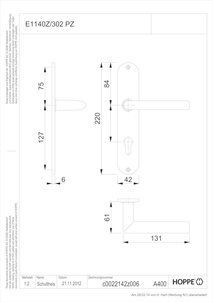 Produktinformationen "HOPPE Drückergarnitur Stockholm E1140Z/302, LS,PZ72/8,F69,TS 35-45,o. No."