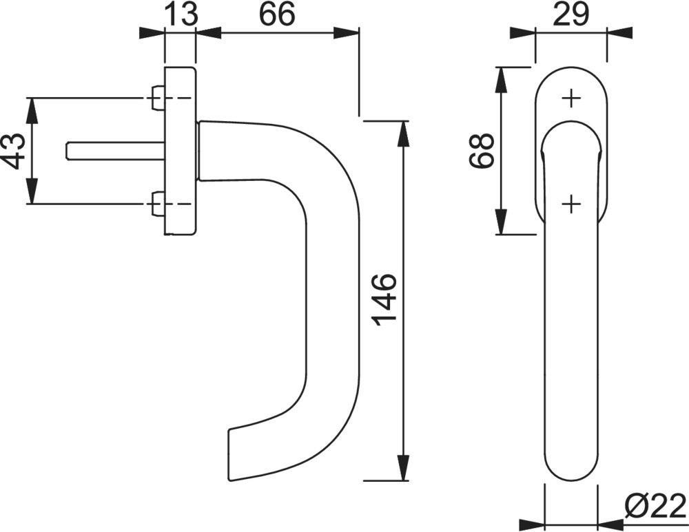 Fenstergriff Paris 038/U30; Produkttyp: Fenstergriff; Produkttyp (Hersteller): Fenstergriff; Ausführung: Standard; Rastung: 90°; Stütznocken: mit Stütznocken; Verriegelungsart: mit selbsttätiger Verriegelung; Material: Aluminium; Montageart: aufliegend; Befestigungsart: verdeckt verschraubt; Anwendung: für nach innen öffnende Fenster und Fenstertüren; Länge: 141 mm; Höhe: 66 mm; Durchmesser: 20 mm; Befestigungsabstand: 43 mm; Form Rosette: oval; Breite Rosette: 29 mm; Höhe Rosette: 68 mm; Stärke Rosette: 14 mm; Material Unterkonstruktion: Kunststoff; Durchmesser Stütznocken: 10 mm; Einsatzbereich: Drehkipp; Fensterwerkstoff: Holz,Kunststoff,Aluminium; Vierkant: 7 mm; Stift vorstehend: 32 mm; DIN-Richtung: DIN Links-Rechts; Farbe: silberfarben; Farbton: naturfarben; Oberfläche: eloxiert; Aufdruck: mit Logo