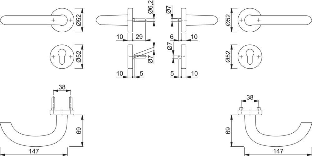 Drückergarnitur Marseille FS-1138/42H/42HS; Produkttyp: Drückergarnitur; Produkttyp (Hersteller): Drückergarnitur; Ausführung: Rosette; Befestigungsart Drückerrosette (außen): verdeckt verschraubt; Befestigungsart Drückerrosette (innen): verdeckt verschraubt; Befestigungsart Schlüsselrosette (außen): verdeckt verschraubt; Befestigungsart Schlüsselrosette (innen): verdeckt verschraubt; Befestigungstechnik: mit Stütznocken; Montageart: aufliegend; Form Drückerrosette: rund; Form Schlüsselrosette (außen): rund; Form Schlüsselrosette (innen): rund; Vierkant: 9 mm; Material: Aluminium; Form Türgriff (innen): gebogen; Ausführung Türgriff (innen): mit Stahlkern; Form Türgriff (außen): gebogen; Ausführung Türgriff (außen): mit Stahlkern; Durchmesser Schlüsselrosette: 52 mm; Länge Türgriff (innen): 147 mm; Länge Türgriff (außen): 147 mm; Höhe Türgriff (innen): 69 mm; Höhe Türgriff (außen): 69 mm; Durchmesser Drückerrosette (außen): 52 mm; Durchmesser Drückerrosette (innen): 52 mm; Höhe Drückerrosette (außen): 10 mm; Höhe Drückerrosette (innen): 10 mm; Höhe Schlüsselrosette (außen): 10 mm; Höhe Schlüsselrosette (innen): 10 mm; Lagerung: wartungsfreies Gleitlager,mit Rückholfeder,festdrehbar; Einsatzbereich: Objekttür; Türart: Vollblatt; Türwerkstoff: Stahl,Holz; Lochung: Profilzylinder gelocht; DIN-Richtung: DIN Links-Rechts; Farbe: silber; Farbton: naturfarben; Oberfläche: eloxiert; Ausführung Vierkant: Profilvollstift; Türstärke min.: 40 mm; Türstärke max.: 55 mm; Norm: DIN EN 1906,DIN 18273; Zulassung: für Rauchschutz,für Feuerschutz; EN 1906 - Gebrauchskategorie: Klasse 4; EN 1906 - Korrosionsbeständigkeit: Klasse 5; Klassifizierungsschlüssel EN 1906: 47*-D1150A