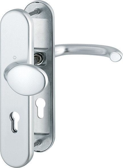 Sicherheits-Wechselgarnitur Marseille FS-76G/3331/3310/1138F; Produkttyp: Sicherheits-Wechselgarnitur; Produkttyp (Hersteller): Sicherheits-Wechselgarnitur; Ausführung: Langschild; Form: oval; Zulassung: für Rauchschutz,für Feuerschutz; Material: Aluminium; Form Türgriff (innen): gebogen; Ausführung Türgriff (innen): mit Stahlkern; Form Türgriff (außen): gekröpft; Ausführung Türgriff (außen): fest; Gewinde Knopf/Griffplatte: M12; Länge Türgriff (innen): 147 mm; Länge Türgriff (außen): 49 mm; Breite Türgriff (außen): 90 mm; Höhe Türgriff (innen): 72 mm; Höhe Türgriff (außen): 50 mm; Material Unterkonstruktion (innen): Zamak/Stahl; Material Unterkonstruktion (außen): Stahl; Gütesiegel: RAL-GZ; Einsatzbereich: Objekttür; Türart: Vollblatt; Türwerkstoff: Stahl,Holz; Zylinderabdeckung: ohne Zylinderabdeckung; DIN-Richtung: DIN Links-Rechts; Widerstandsklasse nach DIN 18257: ES 1; Vierkant: 9 mm; Entfernung: 72 mm; Lochung: Profilzylinder gelocht; Ausführung Vierkant: Rollenwechselstift; Farbe: silberfarben; Farbton: naturfarben; Oberfläche: eloxiert; Schildlänge außen: 250 mm; Schildlänge innen: 250 mm; Schildbreite außen: 54 mm; Schildbreite innen: 54 mm; Schildstärke innen: 10 mm; Schildstärke außen: 12 mm; Türstärke min.: 42 mm; Türstärke max.: 47 mm; Norm: DIN 18273,DIN 18257,DIN EN 1906,DIN EN 179; EN 1906 - Gebrauchskategorie: Klasse 4; EN 1906 - Korrosionsbeständigkeit: Klasse 4; Klassifizierungsschlüssel EN 1906: 47-D1142U