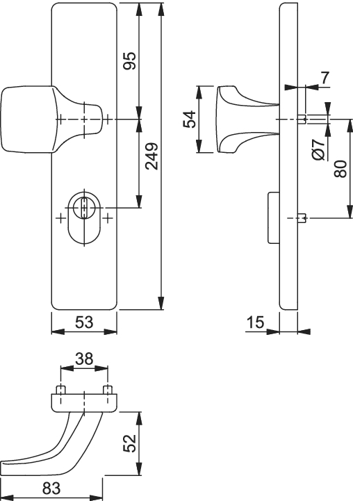 HOPPE®, Zimmertür-Knopf, Abdeckung: auf Schutz-Langschild, Lochung: Profilzylinder gelocht, Entfernung: 72 mm, Vierkant: 8 mm, Modellnummer: E61G/2222ZA, Material: Edelstahl, Farbton: edelstahl matt, Material Unterkonstruktion: Stahl, Befestigungsart: verdeckt verschraubt, Befestigungstechnik: mit Stütznocken, Schildstärke: 15 mm, Form: eckig, Ausführung: mit Zylinderabdeckung, für Kombi-Schutz, Lagerung: fest, ummontierbar, Widerstandsklasse: ES 1 (SK2), Türart: Außentüren,Türwerkstoff : Holz, Stahl, Türstärke min.: 37 mm, Türstärke max.: 42 mm, Eigenschaft: Knopf fest auf Schild,Knopfform : gekröpft, Knopfhöhe: 52 mm, Knopfbreite: 83 mm, Befestigungssystem: Schnellstiftverbindung, Knopfbefestigung: Wechselstift mit Rolle, DIN-Richtung: DIN Links-Rechts, Länge: 249 mm, Breite: 53 mm, Norm: DIN 18257
