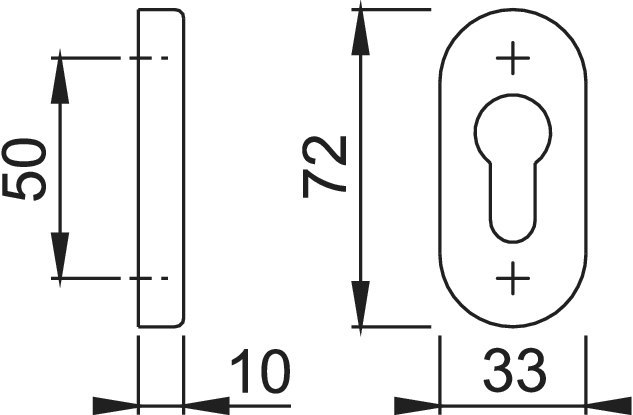 Schlüsselrosette E55S; Produkttyp: Schlüsselrosette; Produkttyp (Hersteller): Schlüsselrosette; Anwendung: außen/innen; Form: oval; Befestigungsart: verdeckt verschraubt; Material: Edelstahl; Länge: 72 mm; Breite: 33 mm; Befestigungsabstand: 50 mm; Material Unterkonstruktion: Zamak; Einsatzbereich: Tür; Türart: Rohrrahmen; Lochung: Profilzylinder gelocht; Farbe: grau; Farbton: edelstahl matt-SecuSan; Stütznocken: ohne Stütznocken; Höhe: 10 mm