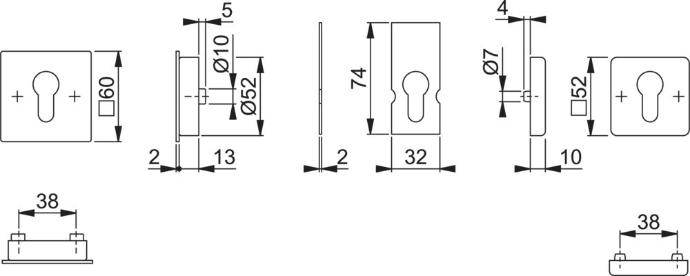 Schutzrosette E75NSB/52S; Produkttyp: Schutzrosette; Produkttyp (Hersteller): Schutzrosette; Form: eckig,flach; Material: Edelstahl; Montageart: aufliegend; Befestigungsart: verdeckt verschraubt; Länge Rosette (außen): 60 mm; Breite Rosette (außen): 60 mm; Länge Rosette (innen): 52 mm; Breite Rosette (innen): 52 mm; Befestigungsabstand: 38 mm; Material Unterkonstruktion (innen): Stahl; Material Unterkonstruktion (außen): Stahl; Einsatzbereich: Haustür; Türart: Vollblatt; Türwerkstoff: Stahl,Holz; Zylinderabdeckung: ohne Zylinderabdeckung; Widerstandsklasse nach DIN 18257: ES 1; Lochung: Profilzylinder gelocht; Farbe: grau; Farbton: edelstahl matt; Höhe Rosette (außen): 2 mm; Höhe Rosette (innen): 10 mm; Türstärke min.: 65 mm; Türstärke max.: 75 mm; Norm: DIN 18257; Zusatzinformation: für die Befestigung am Türschloss als Anbohrschutz,separate Stahlplatte mit Klebepad