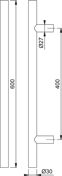 HOPPE®, Haustür-Stoßgriff, Ausführung: gerade, Modellnummer: E5011, Befestigungsabstand: 400mm, Griffdicke: 30mm, Griffhöhe: 90mm, Grifflänge: 600mm, Material: Edelstahl, Farbton: edelstahl matt,Durchmesser Stütze : 27mm, Befestigungsart: verdeckt verschraubt, DIN-Richtung: DIN Links-Rechts, Stütze: gerade, Form: rund, Türflügelanzahl: einflügelig, zweiflügelig, Türwerkstoff: Holz, Stahl