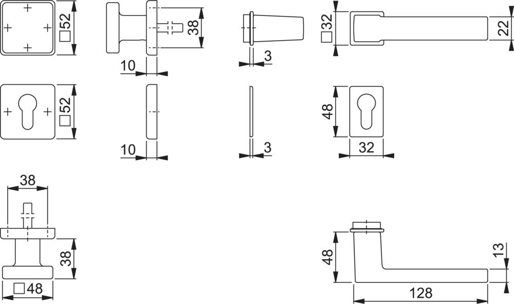 Wechselgarnitur Austin 43L/52K/52KS/668P/669PS-SK/1769; Produkttyp: Wechselgarnitur; Produkttyp (Hersteller): Wechselgarnitur; Ausführung: Rosette; Befestigungsart Drückerrosette (außen): verdeckt verschraubt; Befestigungsart Drückerrosette (innen): aufsteckbar; Befestigungsart Schlüsselrosette (außen): verdeckt verschraubt; Befestigungsart Schlüsselrosette (innen): selbstklebend; Befestigungstechnik: ohne Stütznocken; Montageart: aufliegend; Form Drückerrosette: eckig; Form Schlüsselrosette (außen): eckig; Form Schlüsselrosette (innen): eckig; Vierkant: 8 mm; Material: Aluminium; Material Unterkonstruktion (Griffrosette): Kunststoff; Form Türgriff (innen): L-Form; Form Türgriff (außen): Flachknopf; Ausführung Türgriff (außen): fest; Breite Türgriff (innen): 22 mm; Breite Türgriff (außen): 48 mm; Länge Türgriff (innen): 128 mm; Länge Türgriff (außen): 48 mm; Höhe Türgriff (innen): 48 mm; Höhe Türgriff (außen): 38 mm; Breite Drückerrosette (außen): 52 mm; Breite Drückerrosette (innen): 32 mm; Länge Drückerrosette (außen): 52 mm; Länge Drückerrosette (innen): 32 mm; Höhe Drückerrosette (außen): 10 mm; Höhe Drückerrosette (innen): 3 mm; Breite Schlüsselrosette (außen): 52 mm; Breite Schlüsselrosette (innen): 32 mm; Länge Schlüsselrosette (außen): 52 mm; Länge Schlüsselrosette (innen): 48 mm; Höhe Schlüsselrosette (außen): 10 mm; Höhe Schlüsselrosette (innen): 3 mm; Lagerung: mit Rückholfeder,wartungsfreies Gleitlager; Einsatzbereich: Objekttür; Türart: Vollblatt; Türwerkstoff: Holz,Stahl; Lochung: Profilzylinder gelocht; DIN-Richtung: DIN Links-Rechts; Farbe: grau; Farbton: edelstahloptik matt; Oberfläche: eloxiert; Ausführung Vierkant: Vierkantstift; Türstärke min.: 40 mm; Türstärke max.: 50 mm; Norm: DIN EN 1906; EN 1906 - Gebrauchskategorie: Klasse 3; EN 1906 - Korrosionsbeständigkeit: Klasse 4; Klassifizierungsschlüssel EN 1906: 37-0140U