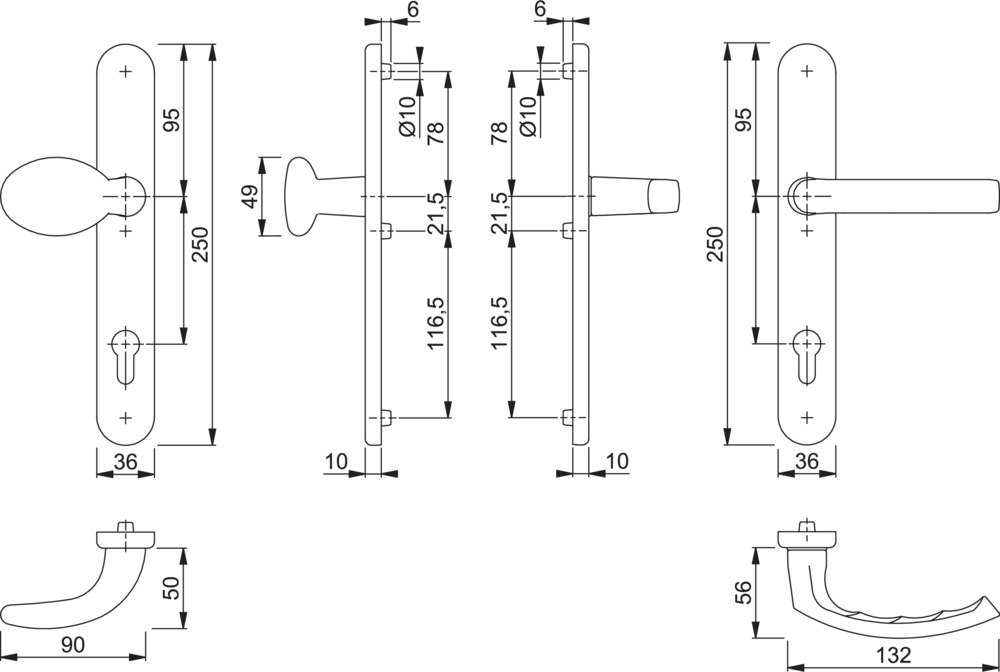 Wechselgarnitur Liège 76G/3357N/1540; Produkttyp: Wechselgarnitur; Produkttyp (Hersteller): Wechselgarnitur; Ausführung: Langschild; Befestigungsart: verdeckt verschraubt; Befestigungstechnik: mit Stütznocken; Form: oval; Vierkant: 8 mm; Material: Aluminium; Material Unterkonstruktion: Zamak; Form Türgriff (innen): gebogen; Form Türgriff (außen): gekröpft; Ausführung Türgriff (außen): fest; Gewinde Knopf/Griffplatte: M12; Breite Türgriff (außen): 90 mm; Länge Türgriff (innen): 132 mm; Länge Türgriff (außen): 49 mm; Höhe Türgriff (innen): 56 mm; Höhe Türgriff (außen): 50 mm; Schildbreite außen: 36 mm; Schildbreite innen: 36 mm; Schildlänge außen: 250 mm; Schildlänge innen: 250 mm; Schildstärke außen: 10 mm; Schildstärke innen: 10 mm; Lagerung: festdrehbar,wartungsfreies Gleitlager,mit Rückholfeder; Einsatzbereich: Haustür; Türart: Rohrrahmen; Türwerkstoff: Kunststoff,Aluminium; Lochung: Profilzylinder gelocht; Entfernung: 92 mm; DIN-Richtung: DIN Links-Rechts; Farbe: silber; Farbton: naturfarben; Oberfläche: eloxiert; Ausführung Vierkant: Rollenwechselstift; Türstärke min.: 67 mm; Türstärke max.: 72 mm