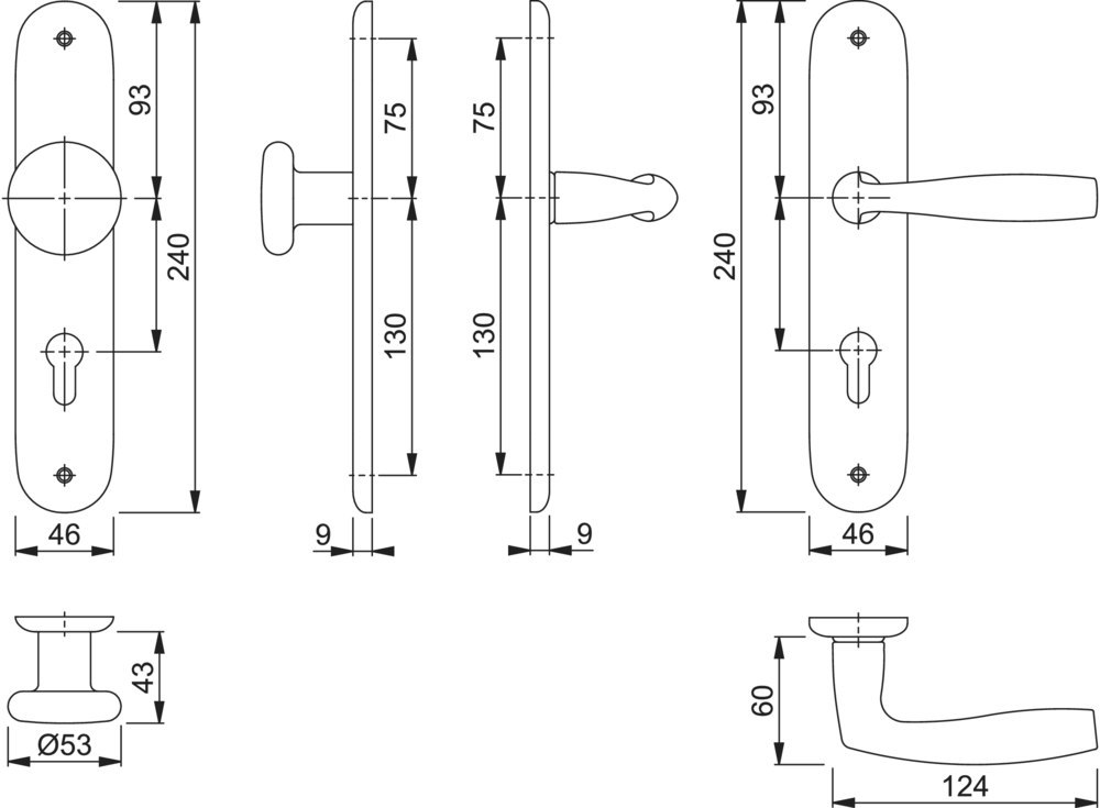 Wechselgarnitur Vitória 53/273P/1515; Produkttyp: Wechselgarnitur; Produkttyp (Hersteller): Wechselgarnitur; Ausführung: Langschild; Befestigungsart: sichtbar verschraubt; Befestigungstechnik: ohne Stütznocken; Form: oval; Vierkant: 8 mm; Material: Aluminium; Form Türgriff (innen): L-Form; Form Türgriff (außen): Flachknopf; Ausführung Türgriff (außen): fest; Gewinde Knopf/Griffplatte: M12; Durchmesser Türgriff (außen): 53 mm; Länge Türgriff (innen): 124 mm; Höhe Türgriff (innen): 60 mm; Höhe Türgriff (außen): 43 mm; Schildbreite außen: 46 mm; Schildbreite innen: 46 mm; Schildlänge außen: 240 mm; Schildlänge innen: 240 mm; Schildstärke außen: 9 mm; Schildstärke innen: 9 mm; Lagerung: wartungsfreies Gleitlager,mit Rückholfeder; Einsatzbereich: Wohnungseingangstür,Objekttür; Türart: Vollblatt; Türwerkstoff: Holz,Stahl; Norm: DIN EN 1906; Lochung: Profilzylinder gelocht; Entfernung: 72 mm; DIN-Richtung: DIN Links-Rechts; Farbe: silber; Farbton: naturfarben; Oberfläche: eloxiert; Ausführung Vierkant: Rollenwechselstift; Türstärke min.: 35 mm; Türstärke max.: 45 mm; EN 1906 - Gebrauchskategorie: Klasse 3; EN 1906 - Korrosionsbeständigkeit: Klasse 4; Klassifizierungsschlüssel EN 1906: 37-0140A