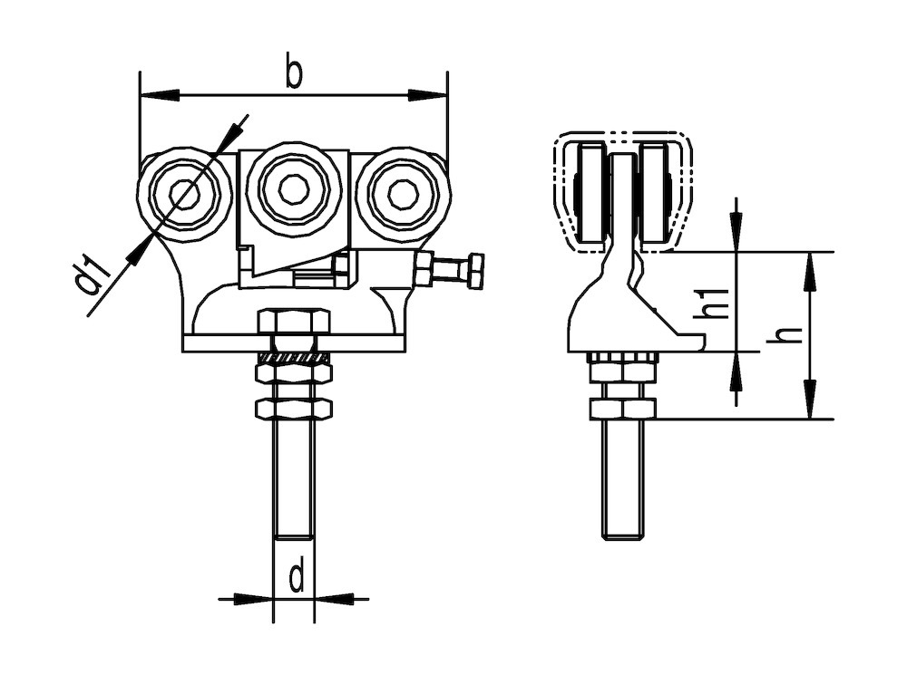 HELM Schiebetor Rollapparat, Modellnummer: 192, Ausführung: doppelpaarig, mit Gegendruckrolle, mit Pendelgelenk, Material Rollapparat: Guss, Oberfläche Rollapparat: lackiert, für Profil-Nr.: 100, Befestigungsart: zum Einhängen, Länge Rollapparat: 65 mm, Rollendurchmesser: 22 mm, Gewindedurchmesser: M10, Gewindelänge: 40 mm, Verstellbarkeit: Höhenverstellbar