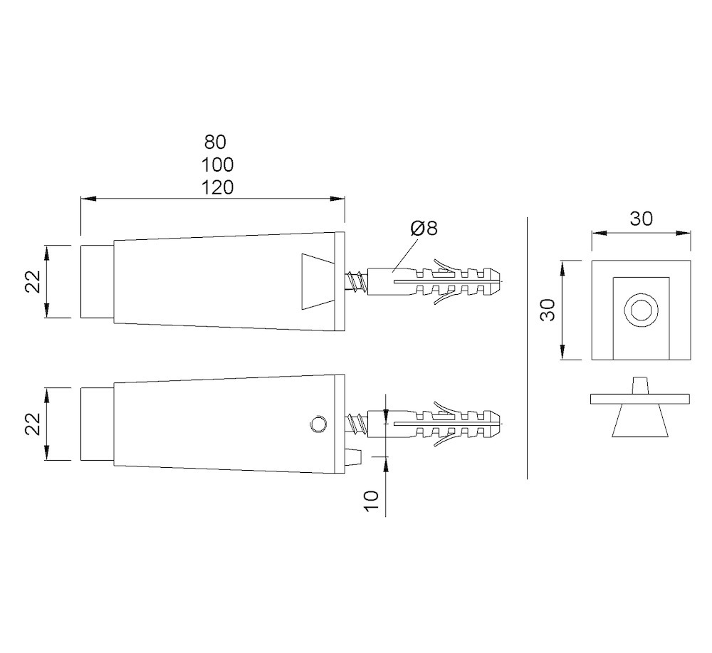 KWS Haustür Wandpuffer, Ausführung: mit einseitigem Gummipuffer, Modellnummer: 2037, Material: aluminium, Farbton: silberfarbig, Oberfläche: eloxiert, geschliffen, poliert, Befestigungstechnik: mit Verdrehsicherung, Befestigungsart: verdeckt verschraubt, Länge: 120 mm, Breite Anschraubplatte: 30 mm, Höhe Anschraubplatte: 30 mm, Form: eckig, konisch, Türgewicht max.: 40 kg, Farbe Gummipuffer: weiß