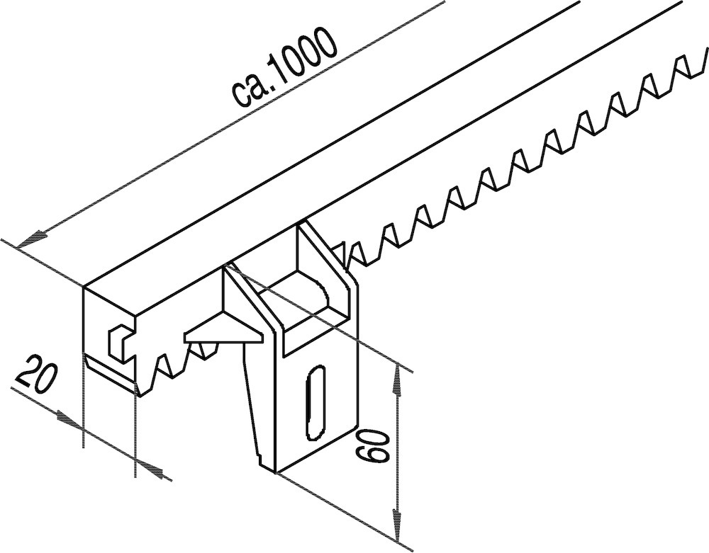 HELM Schiebetor Zahnstange, Ausführung: mit Stahlkern, Breite: 20 mm, Höhe Befestigungswinkel: 60 mm, Länge: 1000 mm, Material: Kunststoff